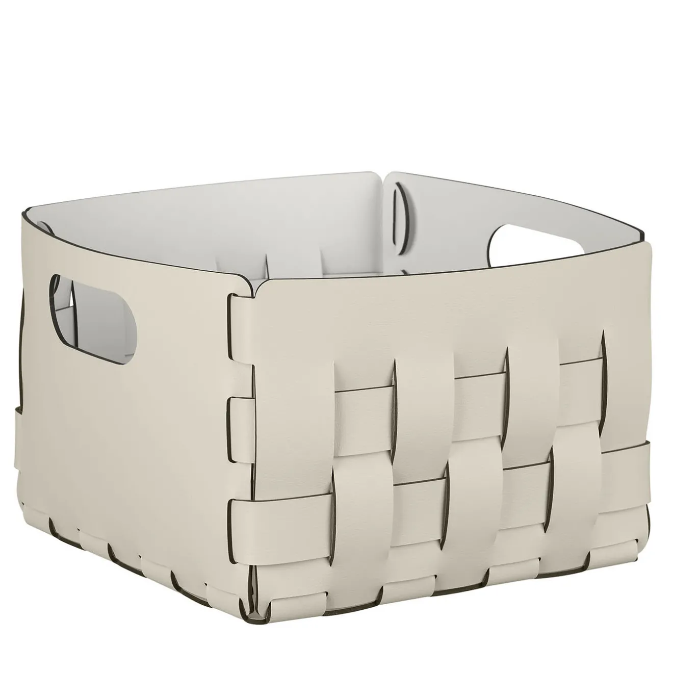 Questo cesto di Ekaterina Borovkova, con il suo motivo a onde di vimini rettangolari e quadrate, è una testimonianza di artigianato creativo. L’esterno in panna cotta e l’interno bianco creano un contrasto cromatico sorprendente, esaltando il suo fascino unico. Perfetto per organizzare biancheria, pantofole, coperte, giocattoli o attrezzature sportive, questo pezzo si integra perfettamente negli interni moderni.
