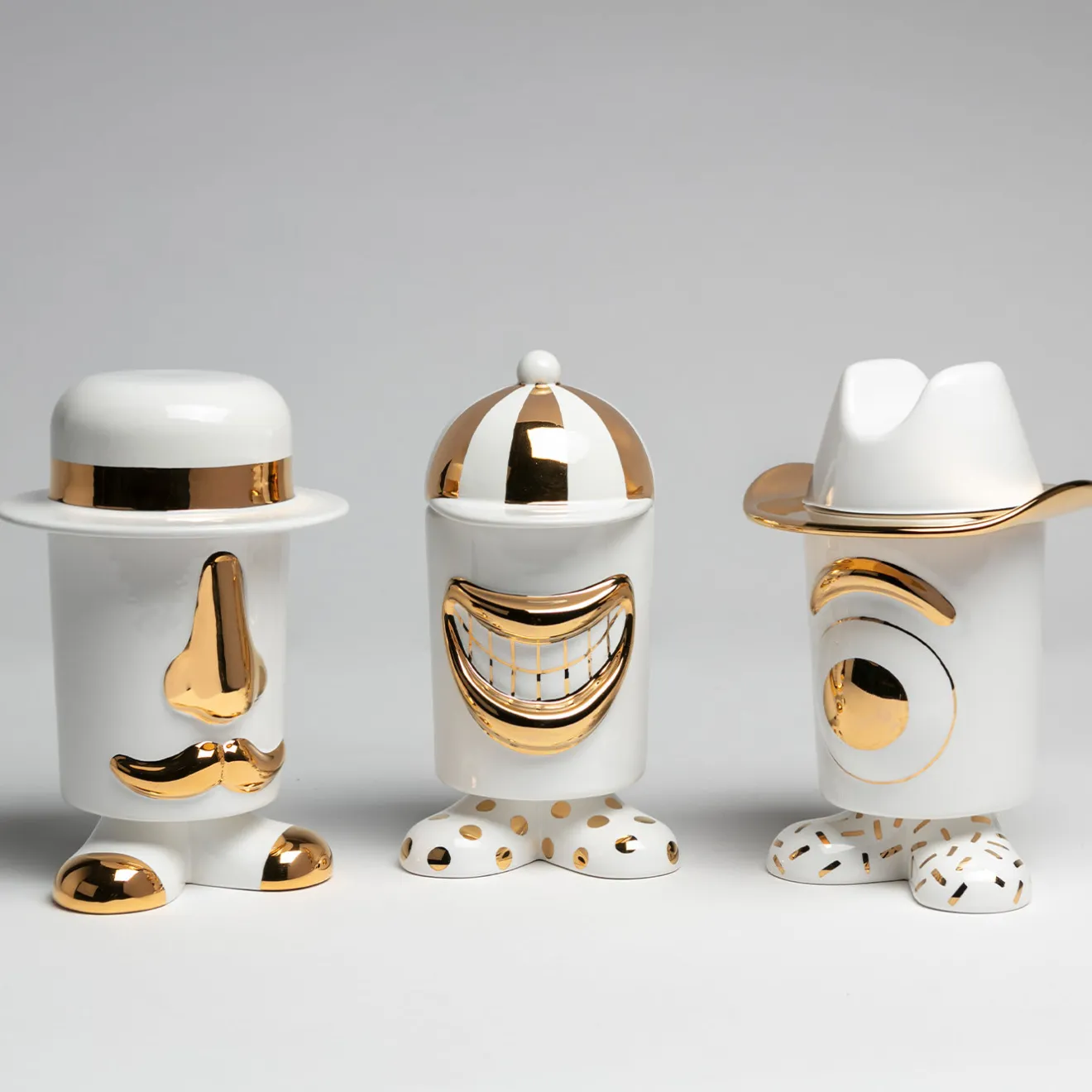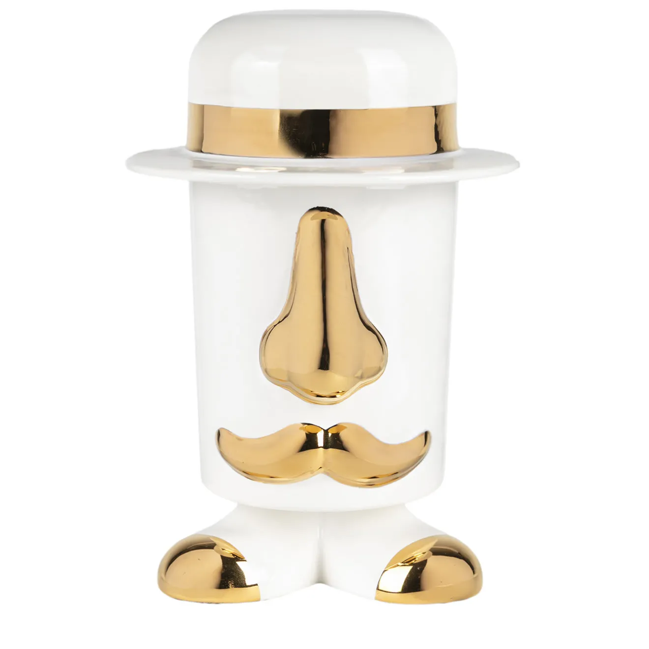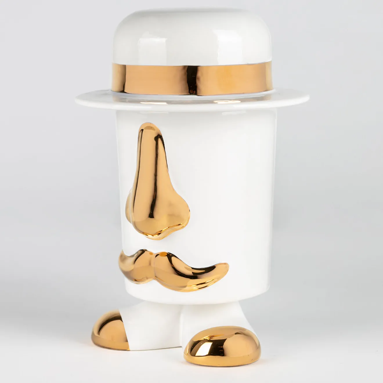 Versione elegante e raffinata di un iconico e colorato disegno di Andrea Maestri, questo contenitore multiuso infonderà fascino in ogni ambiente contemporaneo. Realizzato a mano in ceramica bianca, sfoggia una forma antropomorfa arricchita da dettagli dipinti in oro che ne esaltano i dettagli anatomici sovradimensionati.