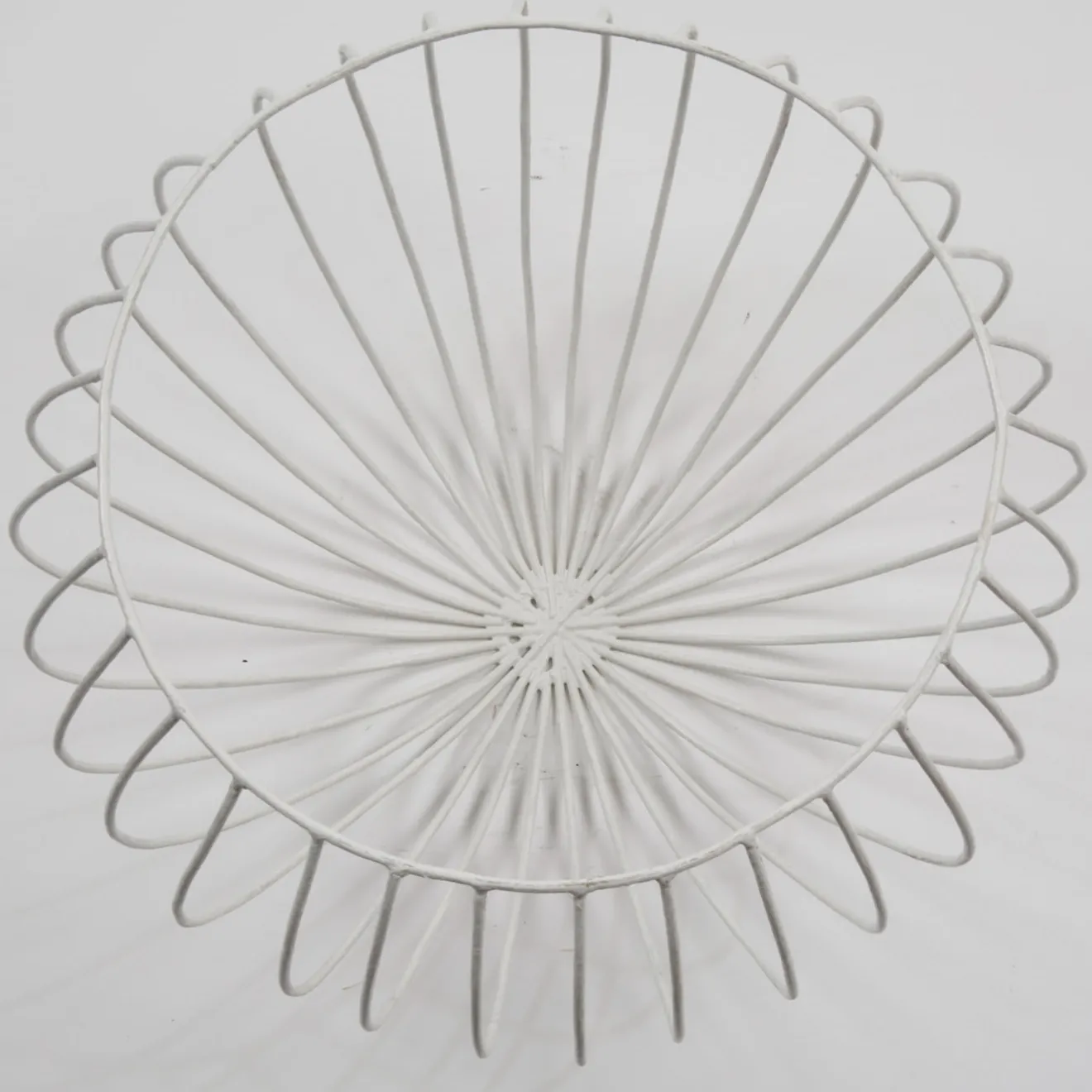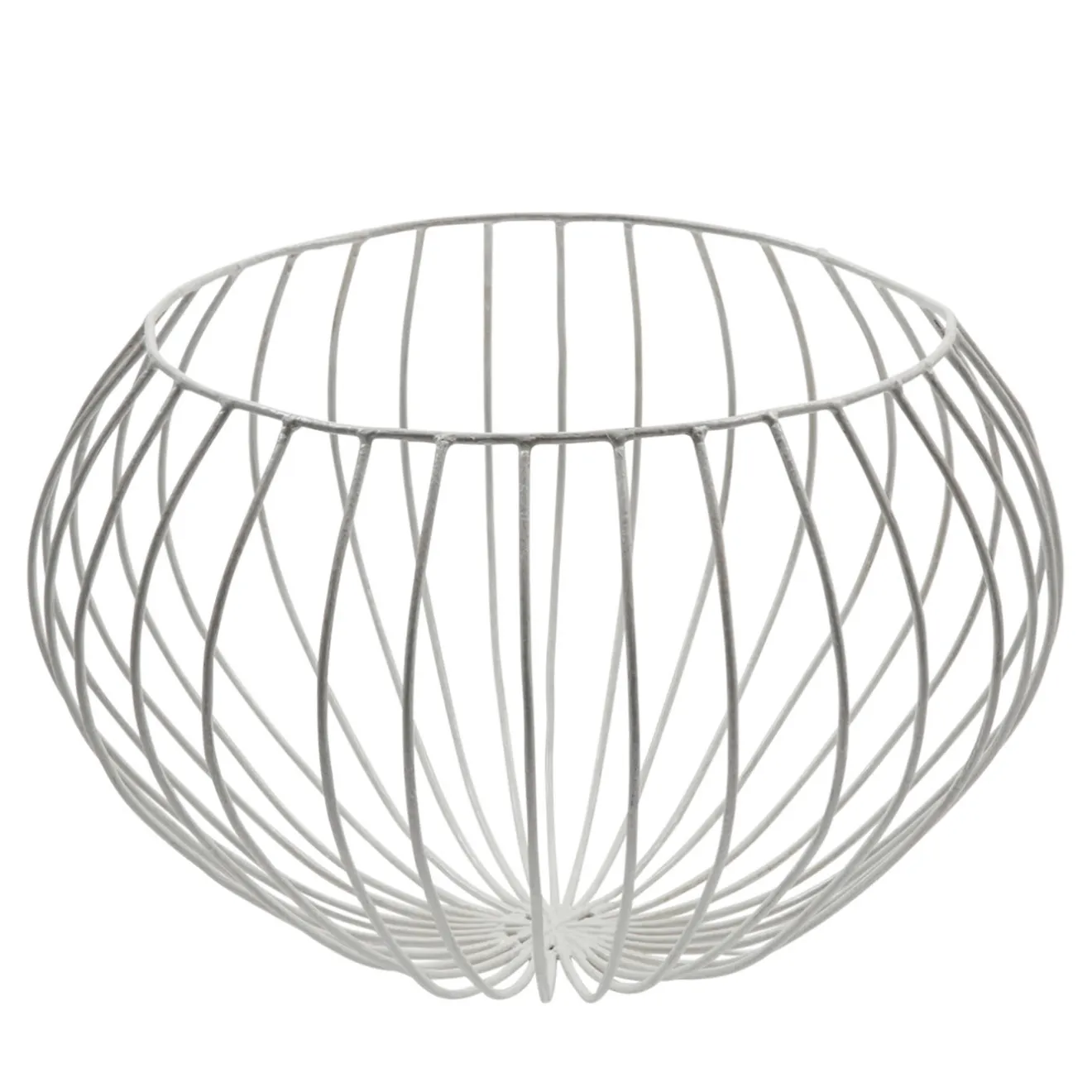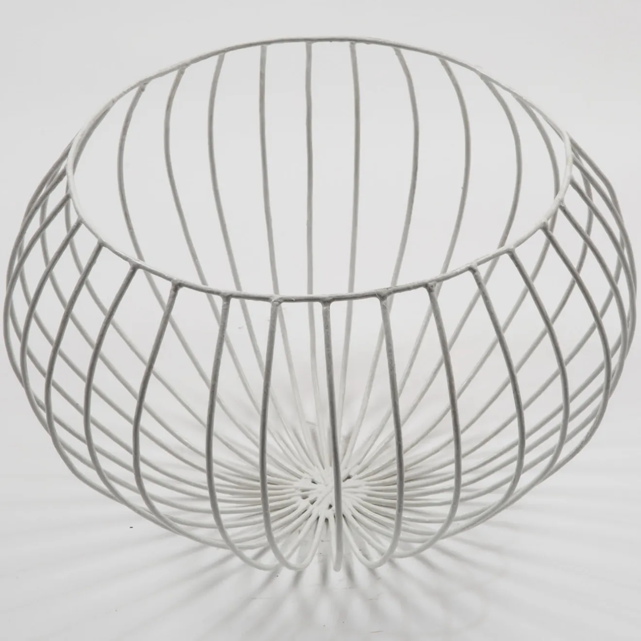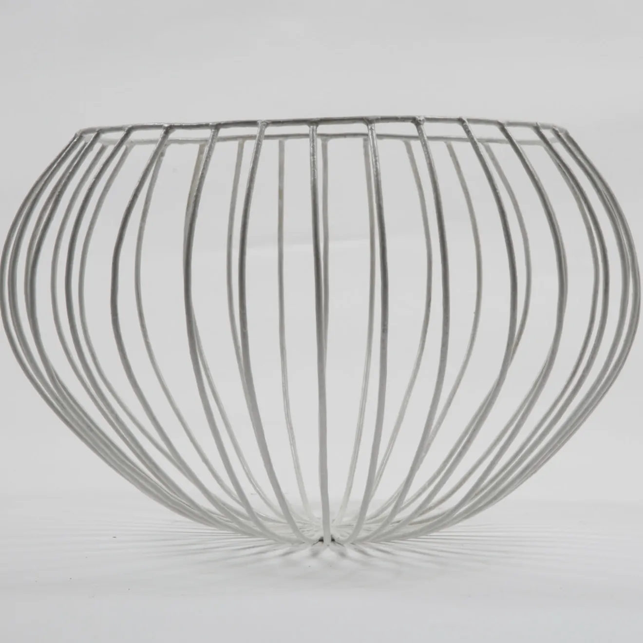 Gustoso vaso bianco a forma di cupola di Sciortino. Il pezzo è realizzato in filo di ferro zincato, con barre di ferro a raggiera che sporgono sul bordo e si piegano sui lati, creando così linee morbide che ricordano i passi di danza. Per i mobili in legno si consiglia una manutenzione occasionale con lucidatura a cera.