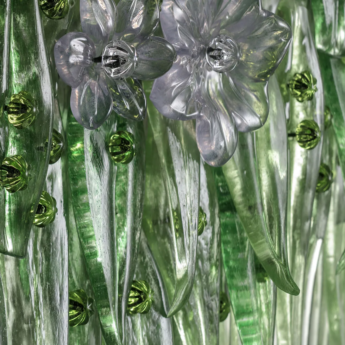 Lo specchio da parete Barena, realizzato in collaborazione con Laura Sattin, presenta un design unico ispirato alla laguna veneziana vista dall’alto, con elementi in vetro verde che somigliano a strisce di terra emergenti dall’acqua. Ogni dettaglio di fiore e foglia è lavorato a mano, componendo un motivo armonioso e organico. Lo specchio è presentato su una base in legno laccato nero elegante, che fonde espressione artistica e decorazione funzionale. È stato esposto nel 2022 come parte di un prestigioso evento di arte del vetro.