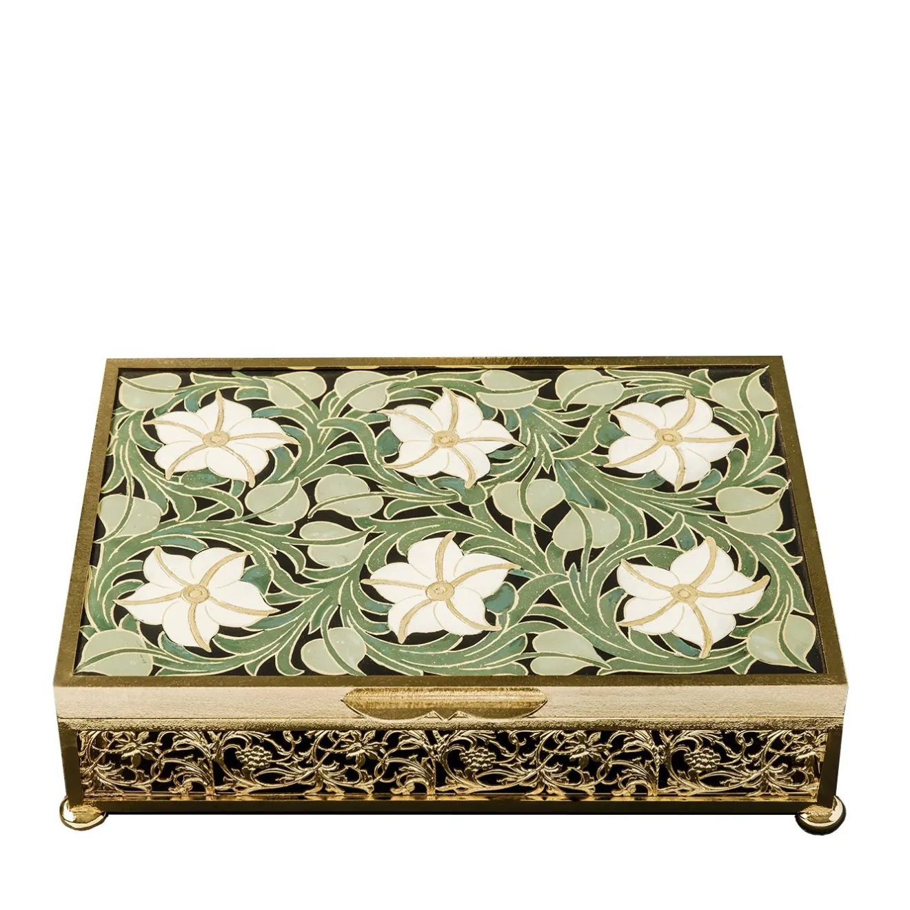Questo cofanetto è un pezzo unico di artigianato e fa parte della collezione Luxury di Bianco Bianchi. Il coperchio è fissato da una cerniera in bronzo placcato oro. La struttura in ferro battuto è caratterizzata da dettagli estremamente complessi, realizzati a mano con piccoli scalpelli. Le sezioni incise sul coperchio, che raggiungono una profondità di 3 o 4 millimetri, sono state riempite con intarsi di ardesia colorata che formano un lussuoso motivo floreale. Il resto della scatola è stato ricoperto di foglia d’oro e l’interno è stato foderato di velluto nero.