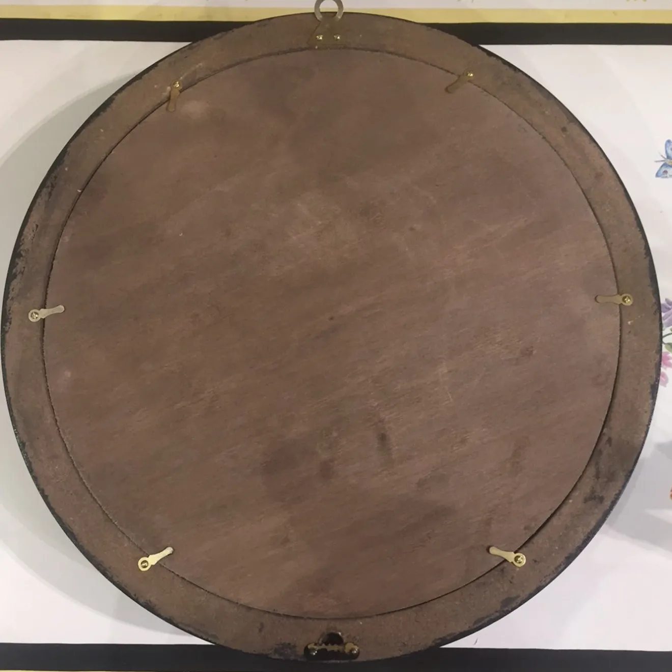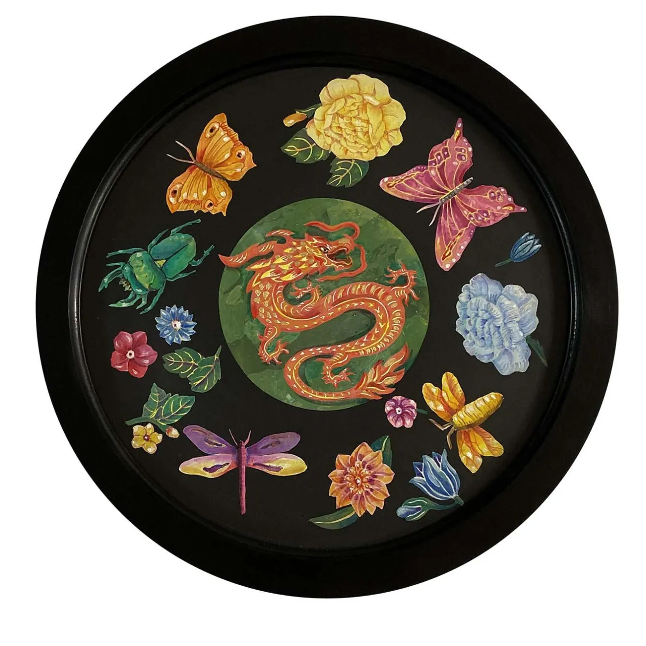 Caratterizzato da uno splendido disegno di un drago circondato da insetti e fiori, questo pezzo da parete è stato intricatamente decorato a mano con scagliola su un inserto di piastrelle di ardesia circondato da una cornice di legno nero. Completo di una finitura a cera satinata, questo pezzo unico e interamente realizzato a mano misura 35 cm di diametro, con una piastrella interna di 30 cm.