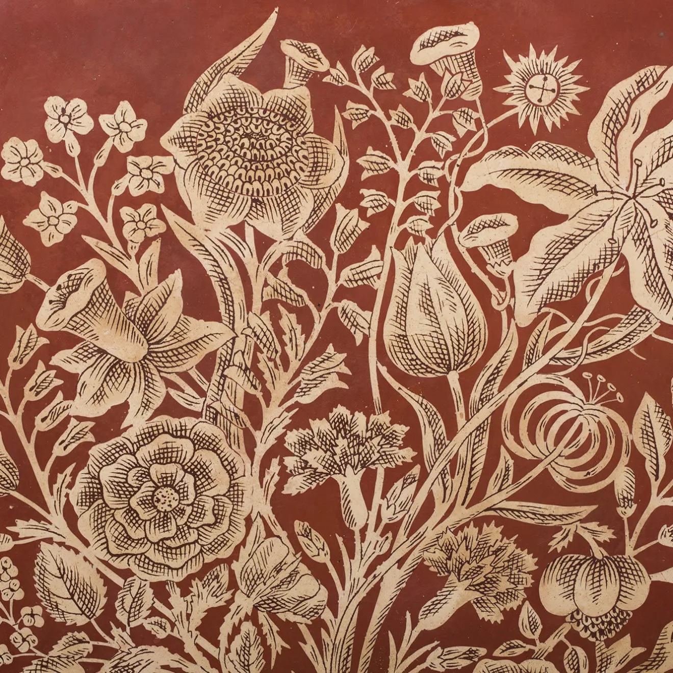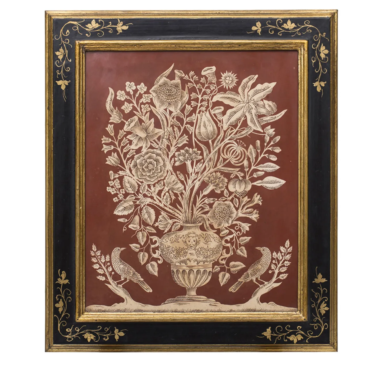 Tableau recherché interamente realizzato a mano in intarsio di marmo rosso e avorio, ottenuto con la tradizionale tecnica della scagliola. Il design si ispira a un originale del XVIII secolo della stessa casa ed è stato abbinato a una classica cornice in legno nero con dettagli in oro.