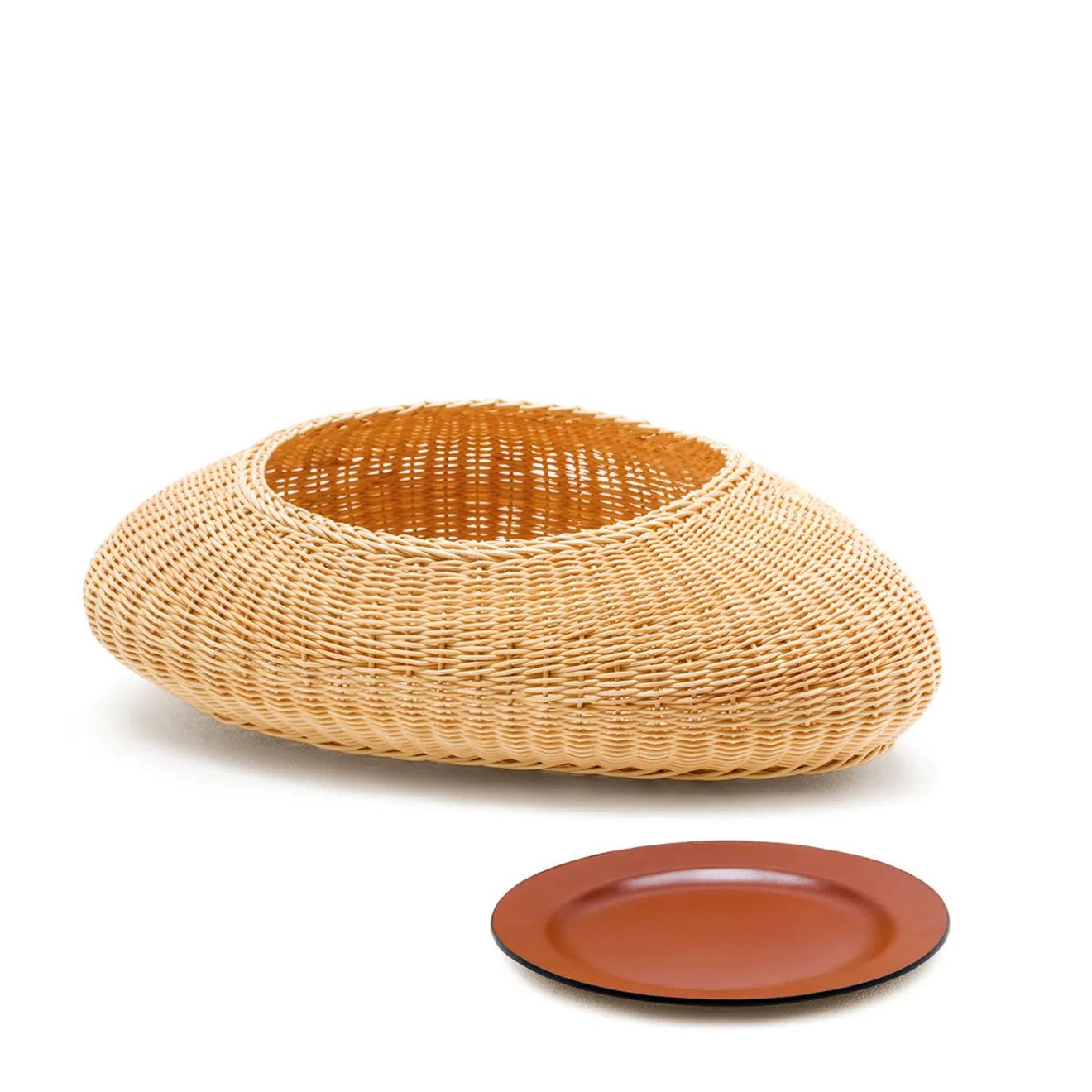 Shizè è un contenitore dalle forme morbide e organiche, interamente intrecciato a mano in rattan naturale. È dotato di un coperchio in pelle che ne copre elegantemente l’apertura. Ispirato alle pietre di fiume, la sua forma riflette le forme ammorbidite nel tempo dallo scorrere dell’acqua.