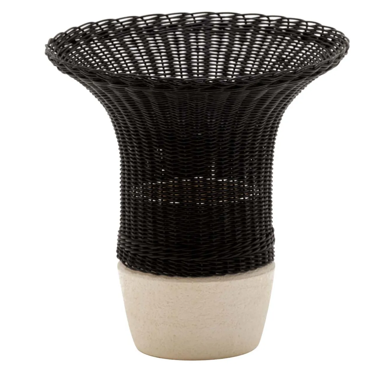 Un vaso in rattan laccato nero, intrecciato per avvolgere la base in ceramica bianca e creare un ritmo di pieni e vuoti. L’uso del materiale ceramico color avorio permette al vaso di contenere l’acqua per i fiori e di essere facilmente pulito dopo l’uso. Una fascia di rattan intrecciato completa la base, che si estende in una forma morbida e armoniosa. Il colore del rattan è disponibile in versione naturale; per maggiori dettagli, consultare il concierge.