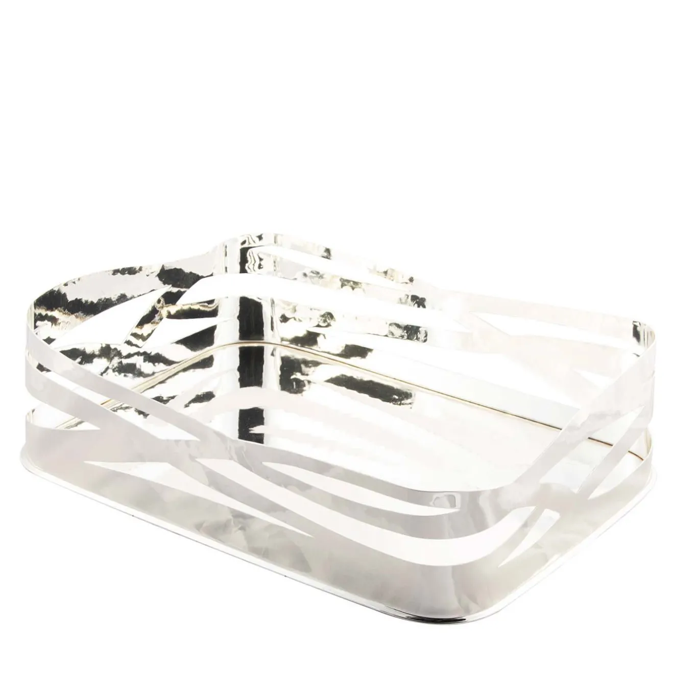 Questo cestino per il pane argentato ha una forma rettangolare e presenta pareti traforate con finitura a specchio che diffondono riflessi brillanti su un elegante tavolo moderno. Composto da una serie di strisce ondulate in un motivo dinamico che ricorda le onde del mare, questo cestino ben proporzionato può essere abbinato al cestino quadrato e alla caraffa che vantano lo stesso design raffinato per ravvivare una tavola festiva o informale.