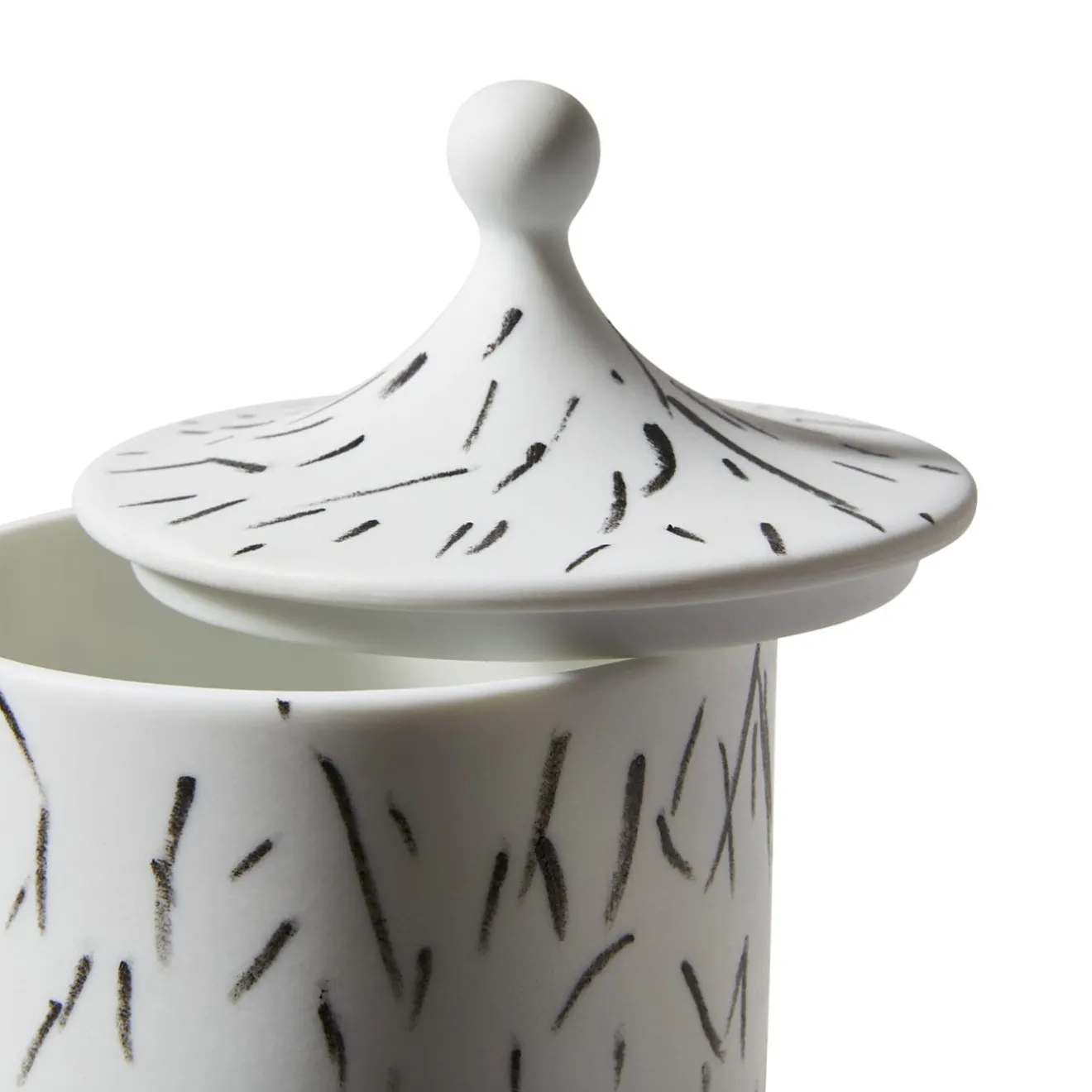 Forme archetipiche selezionate nell’archivio della Manifattura Ginori e reinterpretate da Formafantasma in chiave squisitamente contemporanea contraddistinguono questo prezioso portacandele in porcellana con coperchio. Le pennellate nere sparse sull’esterno – compreso il coperchio con terminale sferico – rivelano la qualità unica del pezzo dipinto a mano, un design raffinato della Collezione Post Scriptum.