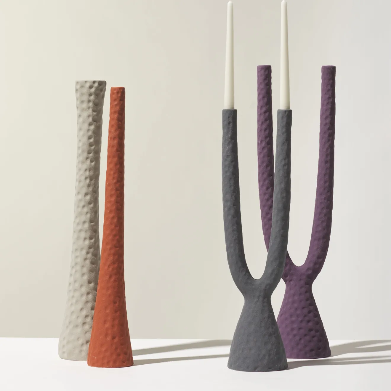 Ispirato a una collezione d’archivio degli anni ’50, questo candelabro è un pezzo scultoreo con forme morbide e organiche che richiamano le nature morte di Morandi. La sua finitura opaca e testurizzata, ottenuta con un’innovativa tecnica di slip aerografato, esalta la superficie naturale della terracotta e crea un effetto polveroso che evoca i contenitori in rame invecchiato. Il suo design a doppio braccio invita a creare composizioni curate insieme ad altri pezzi della stessa serie.
