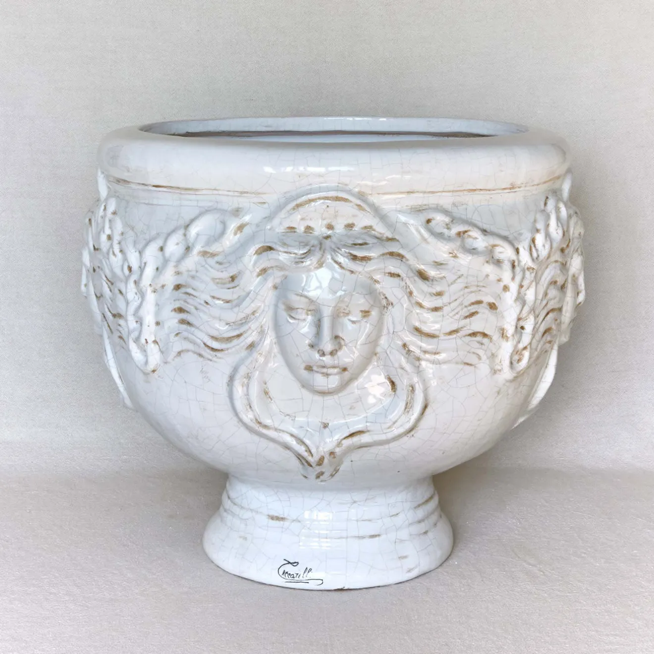 Magnifica opera d’arte scultorea che richiama le opere greco-romane e rinascimentali, questo stupendo cachepot non passerà inosservato in un giardino raffinato. Scolpito con una serie di teste di Medusa, è realizzato a mano in ceramica da esperti artigiani della tradizione ceramica italiana. Un pezzo singolare e iconico per arredamenti classici e moderni.