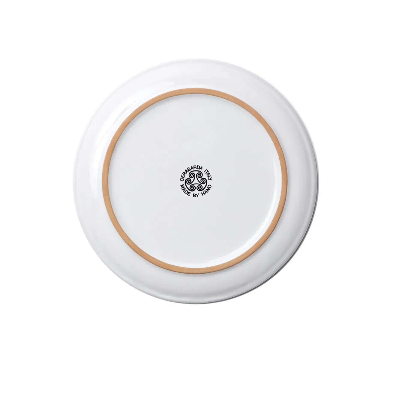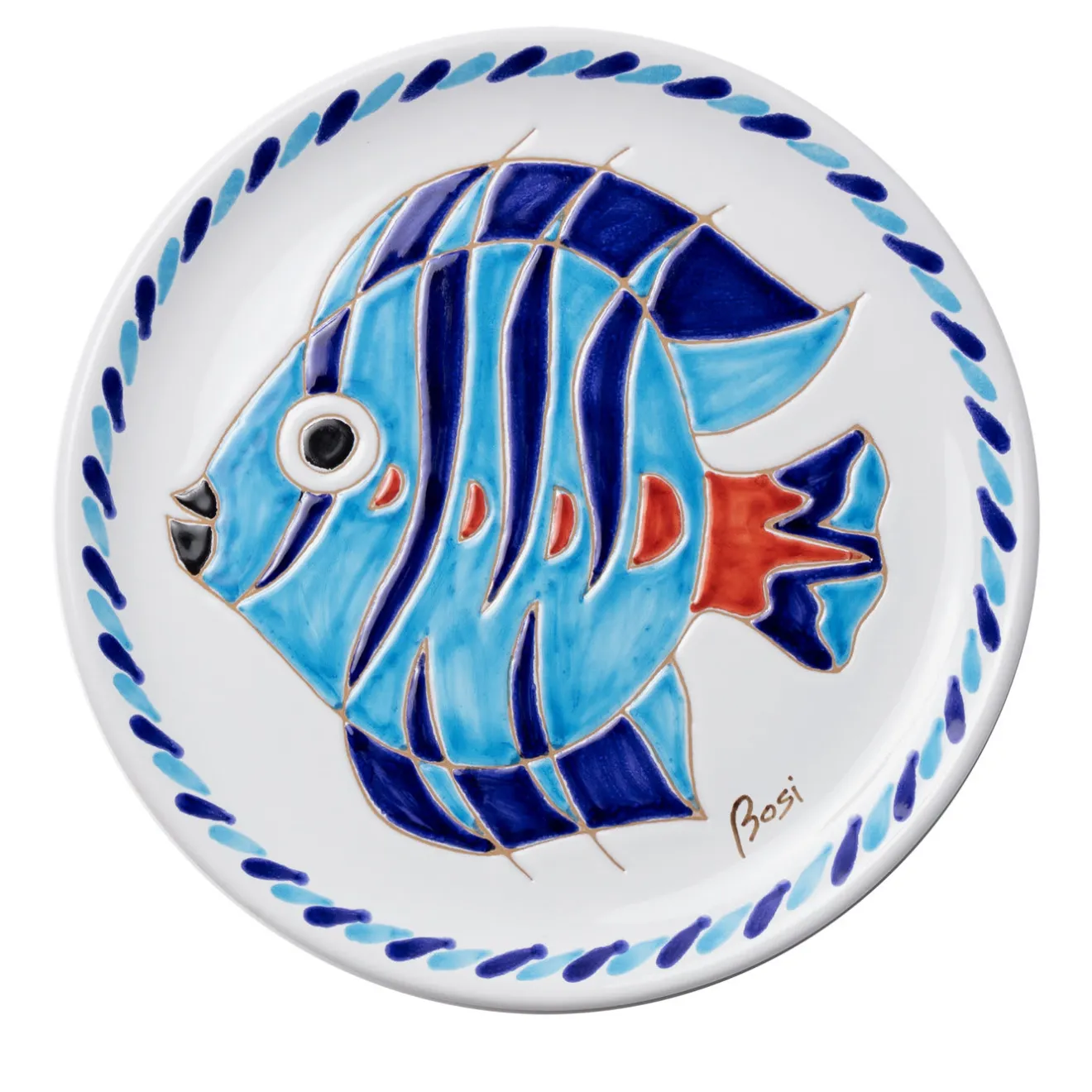Parte di una serie unica di piatti in ceramica disegnati da Giorgio Bosi, questo pezzo farà una dichiarazione elegante in un arredamento rustico o contemporaneo. Realizzato magistralmente a mano, presenta un pesce stilizzato dai colori vivaci, raffigurato con la tradizionale tecnica del graffito che incorpora smalti sulla superficie in terracotta, creando un pezzo unico dal fascino raffinato.