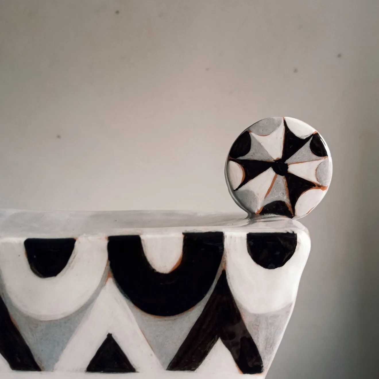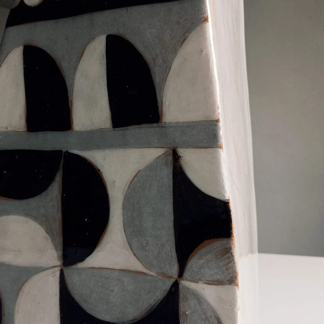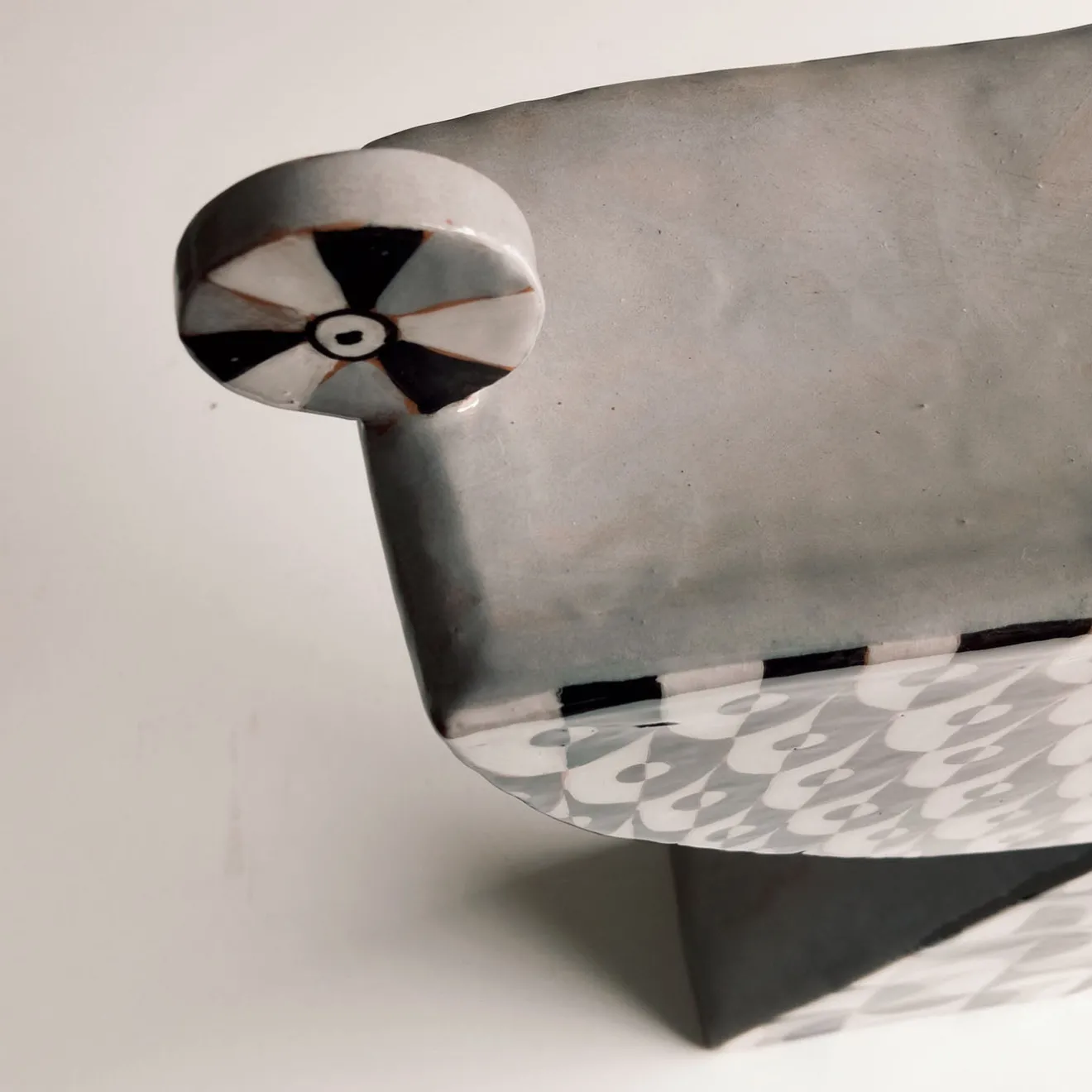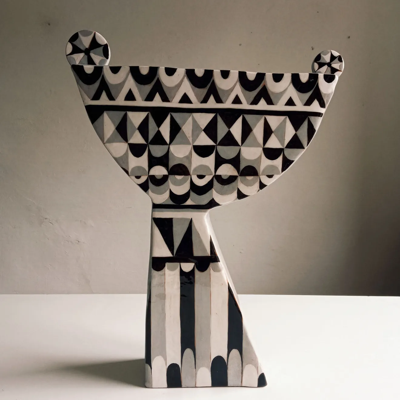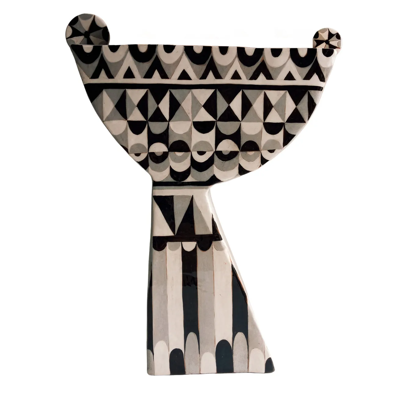 Questa grande alzata presenta una decorazione geometrica ispirata al Bauhaus in toni contrastanti di bianco, nero e grigio. Realizzata con uno spessore minimo, è adatta all’esposizione anche su superfici di dimensioni limitate. Il pezzo è creato con lastre piatte, permettendo al design bidimensionale distintivo di risaltare chiaramente. La sua notevole dimensione e il pattern accattivante la rendono ideale per fungere da punto focale sulla tavola. Ogni pezzo è unico e può presentare leggere variazioni a causa della sua natura artigianale.