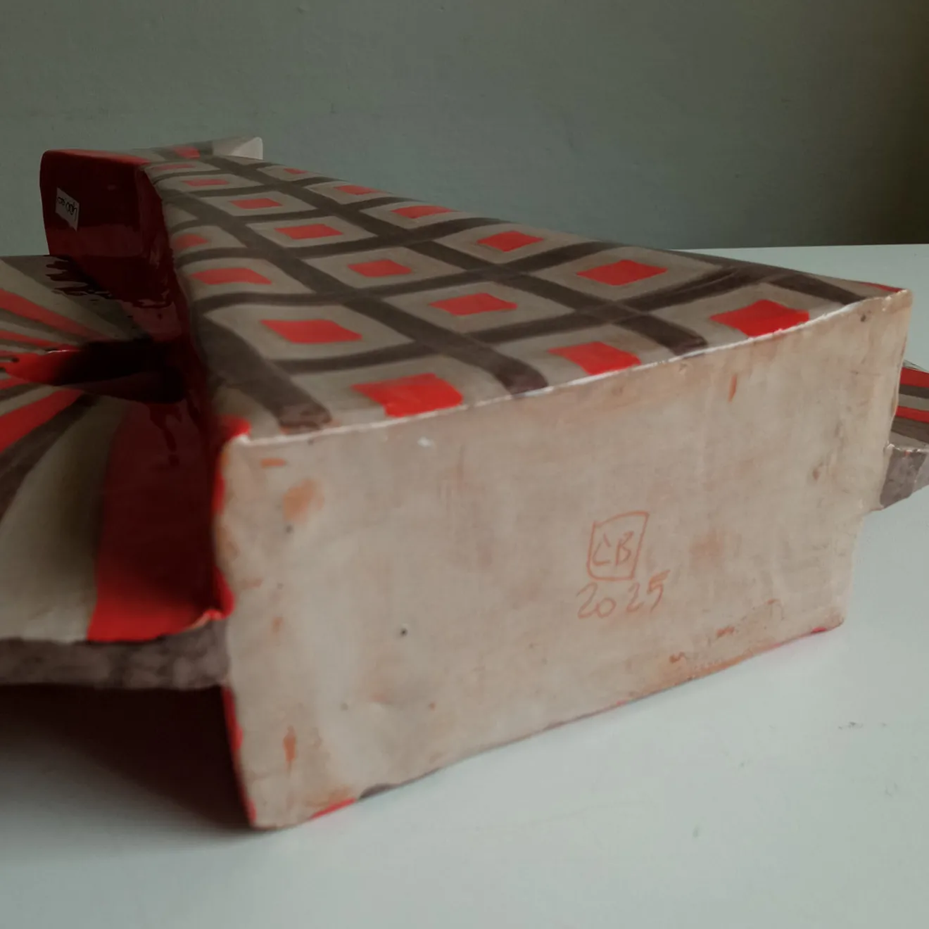 Questo straordinario vaso decorativo presenta un audace design geometrico con una combinazione di forme circolari e trapezoidali. Il pezzo è accentuato da strisce e quadrati rossi e marroni che creano un interesse visivo dinamico. Questo vaso è ideale per aggiungere un tocco artistico agli spazi interni moderni. La sua silhouette unica e il suo vivace motivo lo rendono un accessorio di spicco per l’esposizione su mensole, console o tavoli.