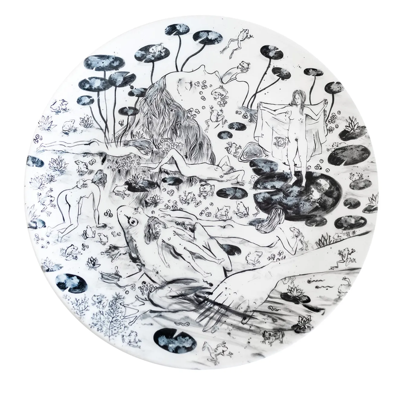 Con un’illustrazione allegorica eccezionalmente dettagliata, questo piatto in ceramica bianca fusa a stampo è decorato a mano con ossido nero e una finitura finale superiore cristallina. Gli straordinari contrasti tra le tonalità chiare e scure lo rendono un pezzo elegante per una zona pranzo moderna o minimal.