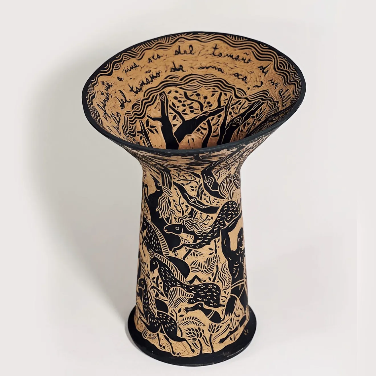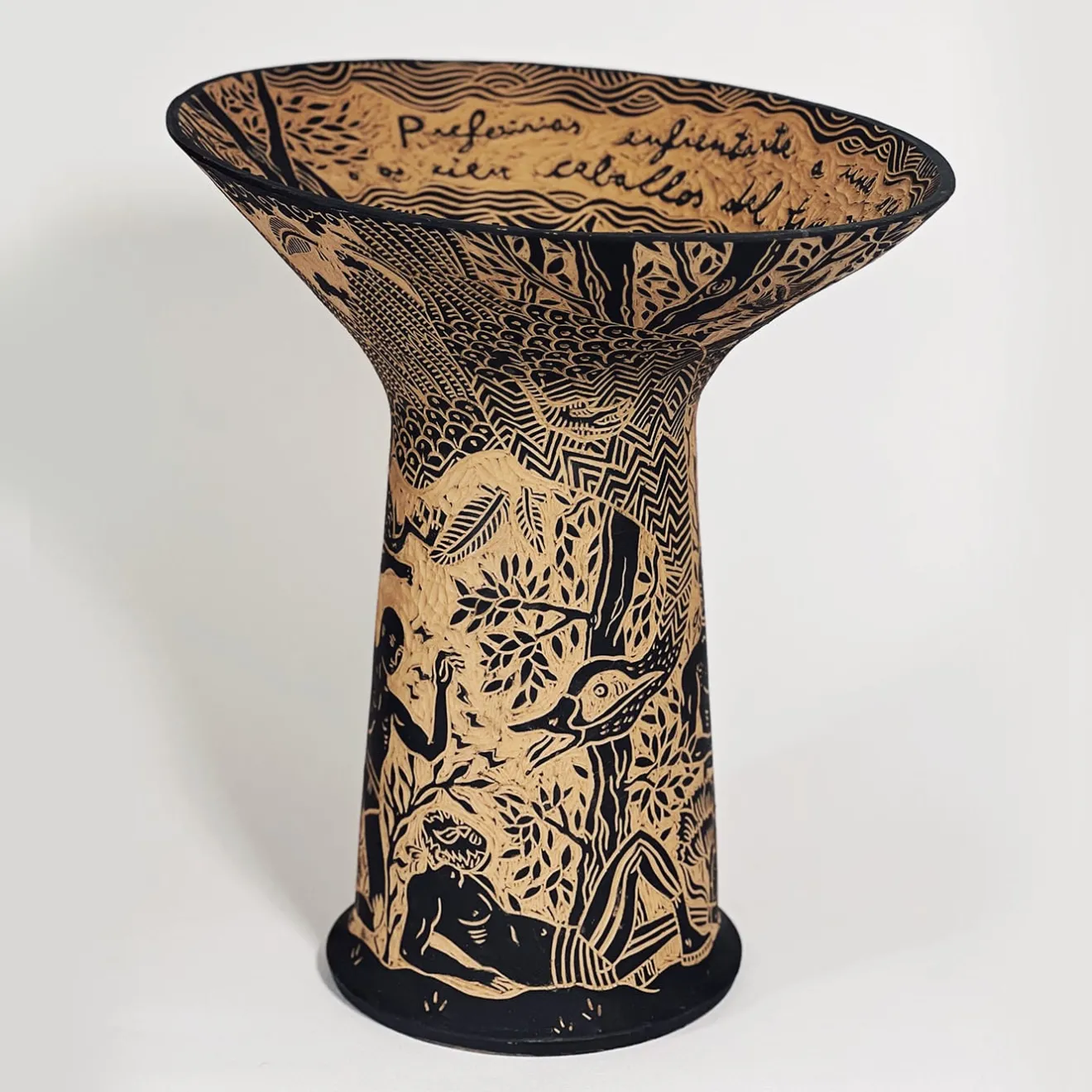 “Preferisci scontrarti con un’oca del calibro di un caballo, o con dieci caballos del calibro di un’oca?”. Vaso in terracotta, realizzato a ruota e decorato con barbottina nera e tecnica a sgraffito.