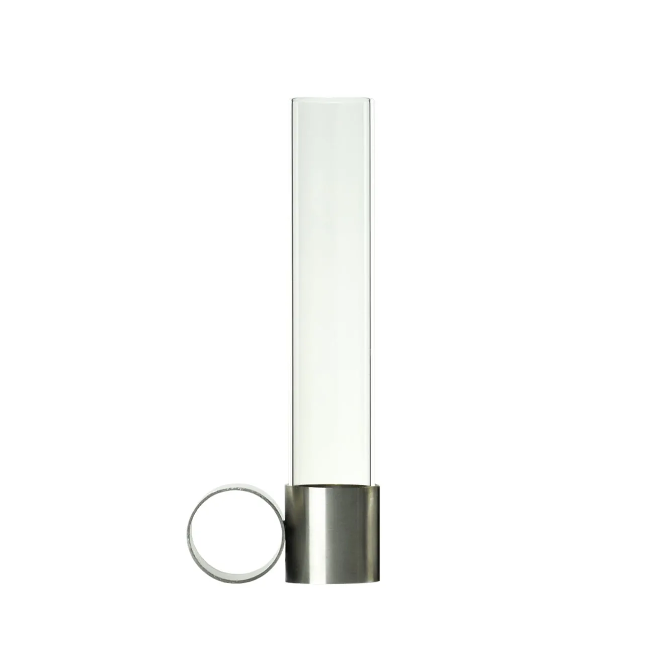 Portacandele e portafiori in un unico oggetto, Tempio del Tempo è stato concepito come un piccolo altare per la casa, creato attraverso l’unione di forme semplici e simboliche che si incastrano senza connessioni e rimangono divisibili: due anelli in acciaio inox uniti tra loro con una saldatura invisibile, una candela in pura cera di soia con stoppino in cotone e un vaso in vetro borosilicato. La chiusura rimovibile della base in acciaio è realizzata in gomma riciclata e crea il supporto ideale per accogliere le candele. Candela e vaso di vetro inclusi.