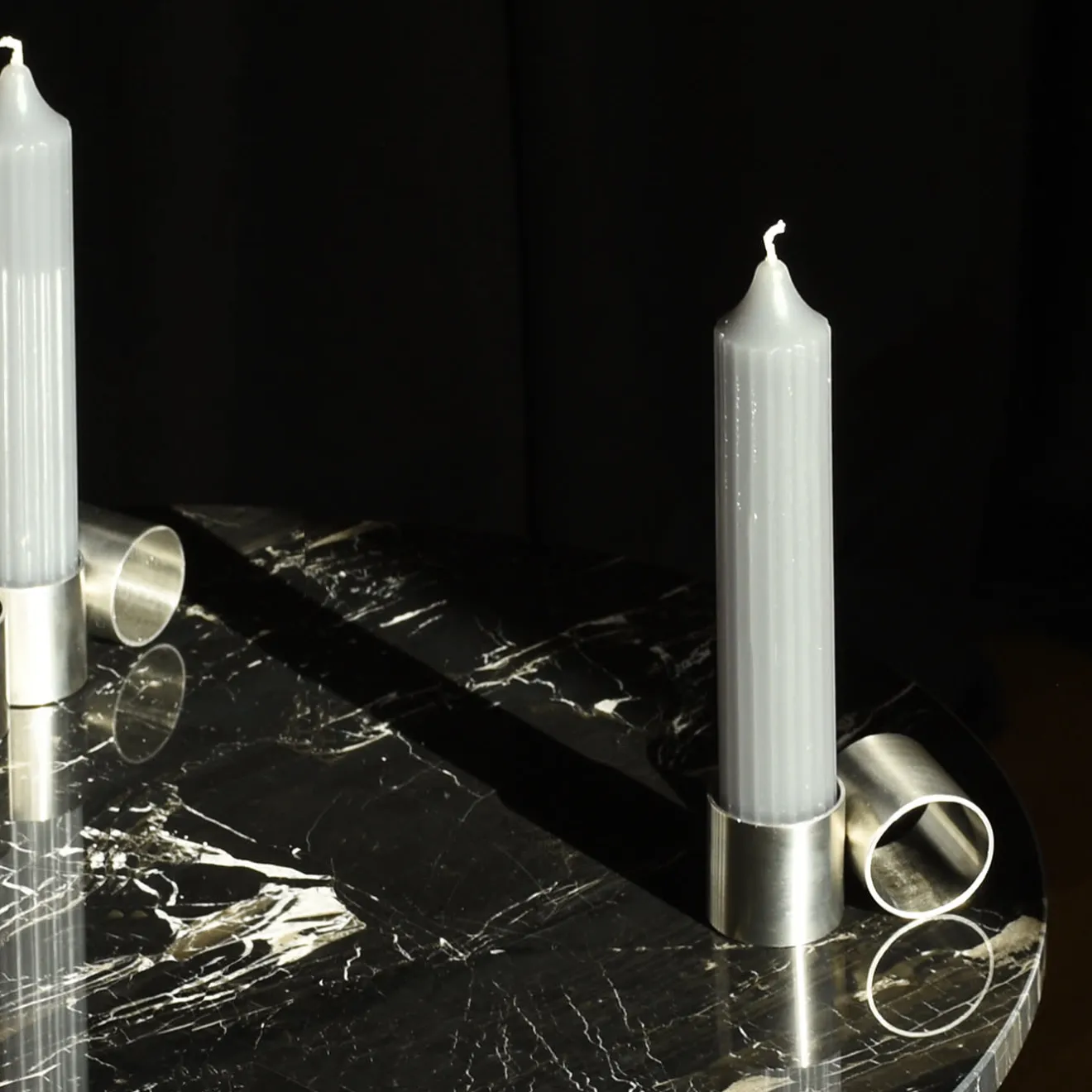Portacandele e portafiori in un unico oggetto, Tempio del Tempo è stato concepito come un piccolo altare per la casa, creato attraverso l’unione di forme semplici e simboliche che si incastrano senza connessioni e rimangono divisibili: due anelli in acciaio inox uniti tra loro con una saldatura invisibile, una candela in pura cera di soia con stoppino in cotone e un vaso in vetro borosilicato. La chiusura rimovibile della base in acciaio è realizzata in gomma riciclata e crea il supporto ideale per accogliere le candele. Candela e vaso di vetro inclusi.