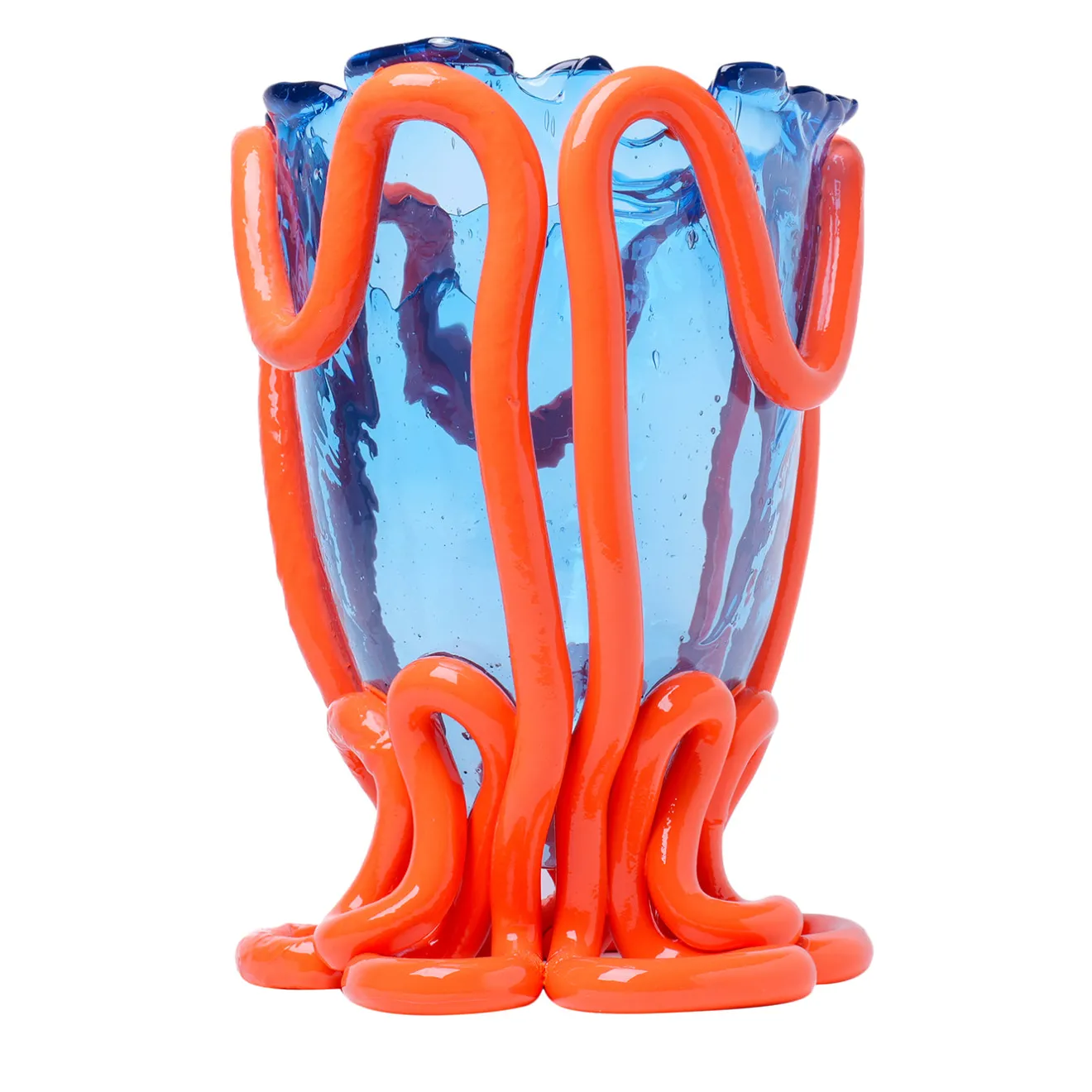 Il grande vaso Indian Summer di Gaetano Pesce presenta un sorprendente corpo in un chiaro blu leggero con vivaci accenti pastello arancioni opachi che ondeggiano e si avvolgono dalla base al bordo. Creato in resina morbida, questo pezzo scultoreo della collezione Fish Design incarna un audace contrasto di colori e forme organiche, rendendolo un accento decorativo affascinante per interni contemporanei. La sua dimensione sostanziale e il design fluido assicurano una presenza distintiva su qualsiasi superficie.