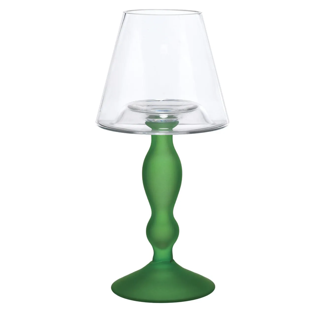 Portacandela in vetro verde con uno stelo scultoreo distintivo che si allarga in una base stabile, sormontato da un paralume in vetro trasparente pensato per proteggere la fiamma e valorizzare l’atmosfera. Questo elemento unisce una forma moderna a una tonalità delicata, elevando l’estetica di qualsiasi tavola o camino. La silhouette raffinata e i contrasti materici lo rendono un elegante accento decorativo adatto a diversi stili d’interni.