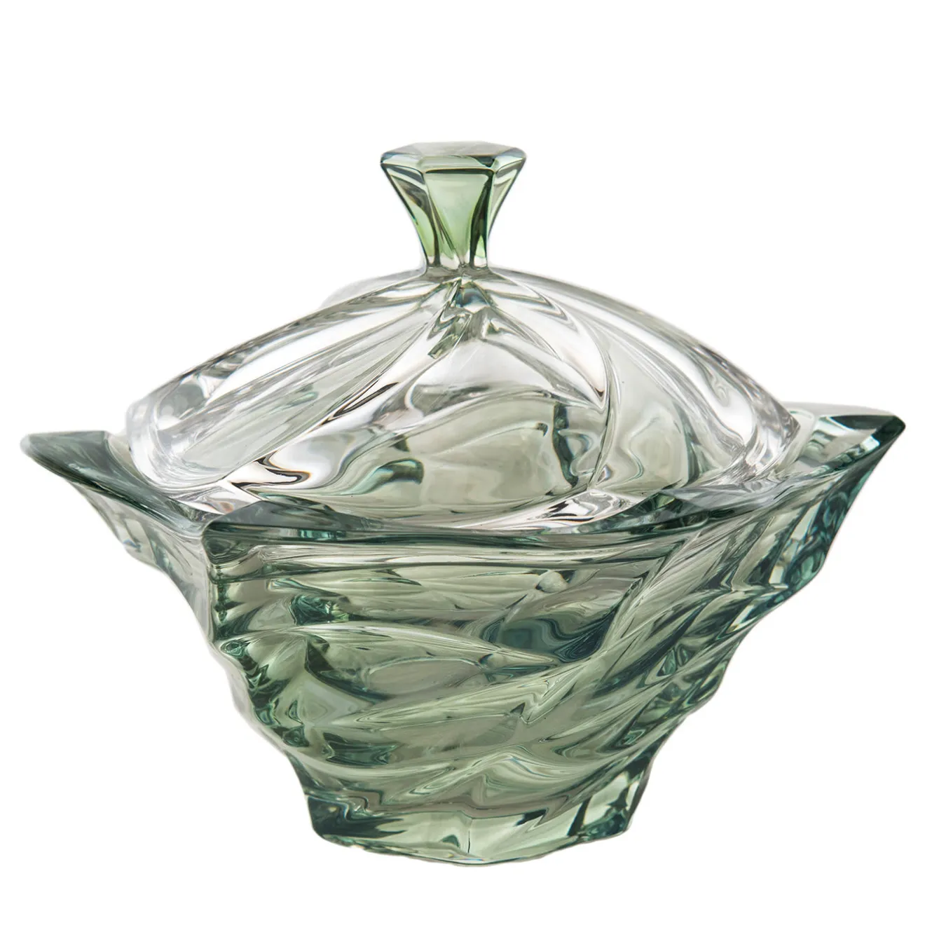 Questo cofanetto, nella sua semplicità, emana una raffinatezza senza tempo e un carattere raffinato ma versatile, che si presta a un’ampia varietà di funzioni. Realizzata a mano in vetro soffiato a bocca, la sua delicata e traslucida tonalità verde è elegantemente accostata a una texture forte e dinamica, caratterizzata da accattivanti linee ritorte che esaltano la ciotola e il coperchio.