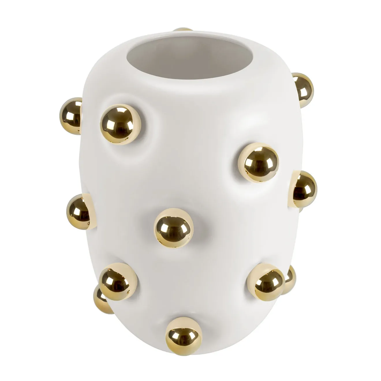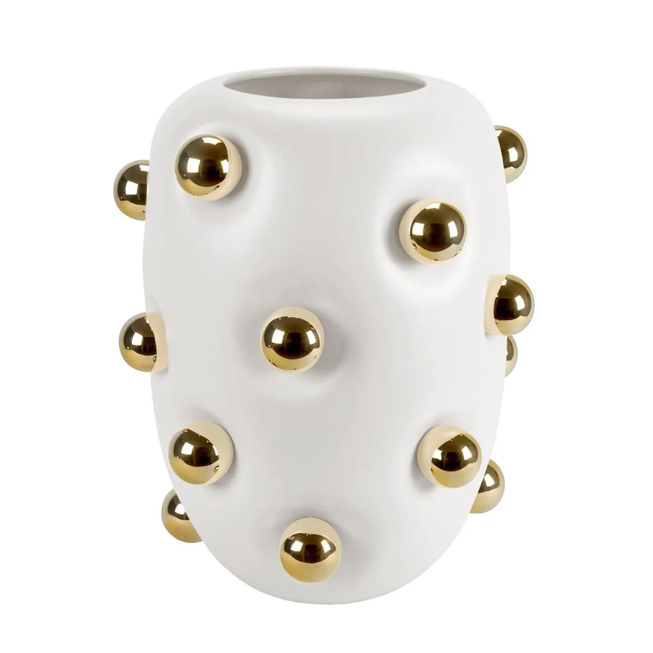 Questo raffinato vaso in ceramica di grandi dimensioni presenta una superficie bianca opaca arricchita da 19 sfere in rilievo placcate in oro 24 carati, creando un contrasto visivo di grande impatto. La sua texture vellutata e la forma scultorea esprimono una sensazione di delicatezza e artigianalità, enfatizzata dall’interazione tra le sfere dorate lucide e il corpo opaco. Parte della collezione BonBon, ogni pezzo è unico e può presentare leggere variazioni che testimoniano la cura e la maestria artigianale. Sono disponibili colori personalizzati su richiesta; per maggiori dettagli, contattare il concierge.