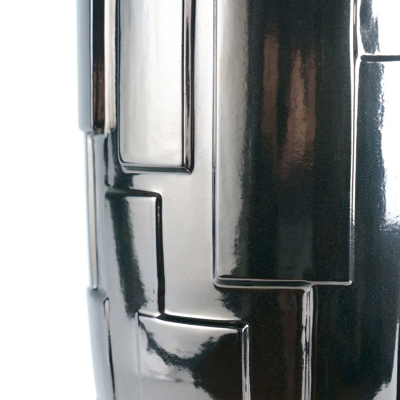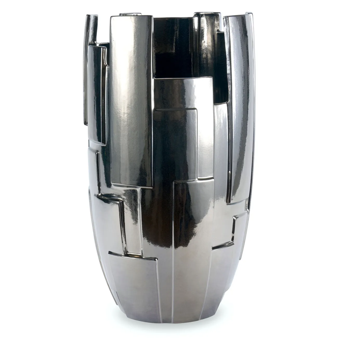 Il vaso Panoplia si distingue per un design scultoreo dinamico, caratterizzato da vuoti interconnessi e solidi sovrapposti che mutano con la prospettiva. La finitura in smalto ad alta temperatura conferisce una lucentezza speculare simile al titanio, donando un’estetica metallica ispirata alle armature. Audace e raffinato, questo pezzo bilancia forza e delicatezza, diventando un elemento decorativo unico. Ogni vaso presenta leggere variazioni che testimoniano la cura artigianale del processo.
