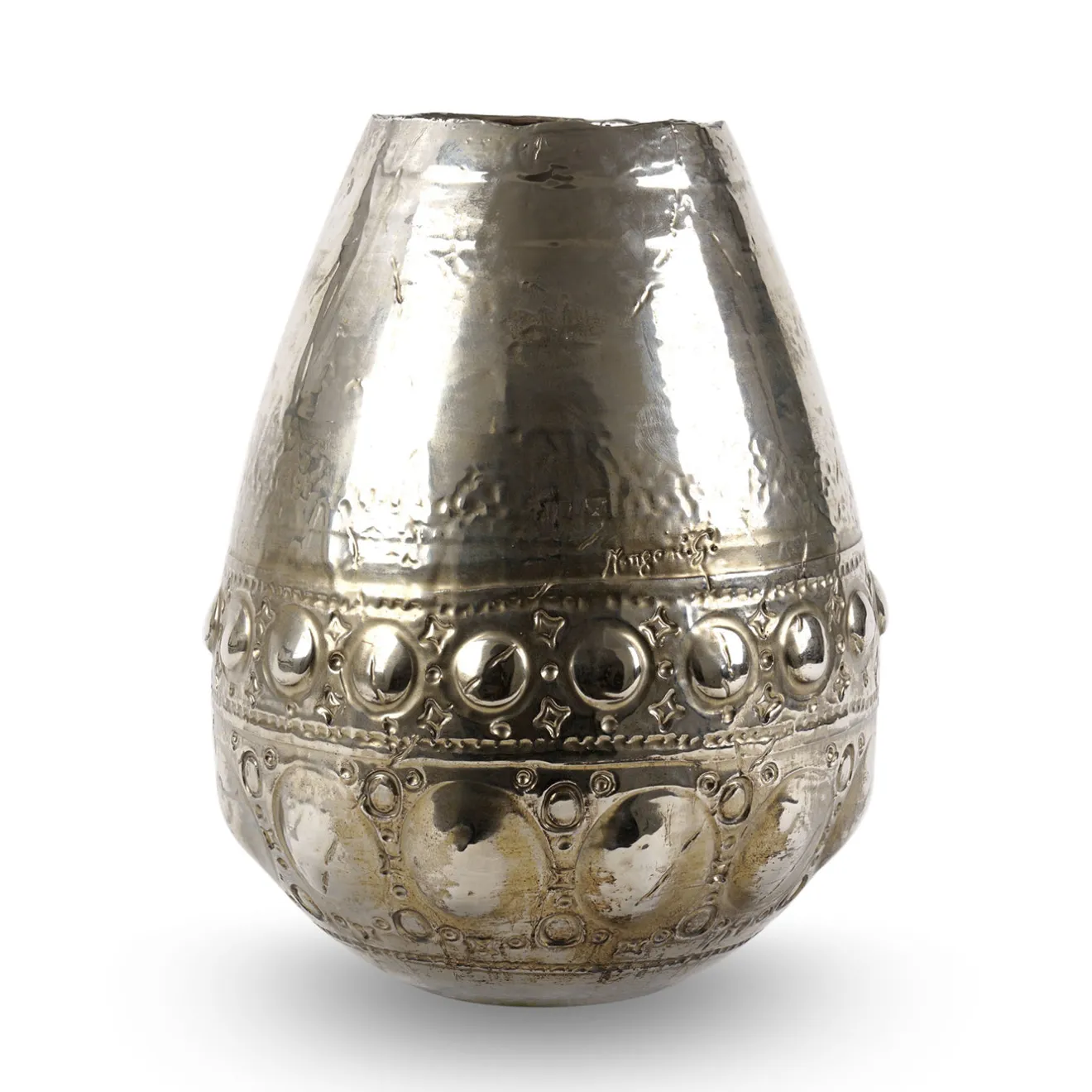 Un vaso scultoreo in argilla rossa di Sansepolcro, caratterizzato da una silhouette sinuosa e arricchito da rilievi geometrici, motivi sferici e raffinate decorazioni a bassorilievo di ispirazione rinascimentale. La superficie è impreziosita da una finitura in platino puro ottenuta con la tecnica della terza cottura e successivamente invecchiata a mano con una miscela naturale a base di cenere di sandalo, che dona una patina senza tempo. Testimonianza della maestria del Maestro Mengoni nella tecnica dell’abborchiato, il vaso reca la firma incisa dell’artista. Lievi variazioni possono verificarsi, a conferma della sua unicità artigianale.