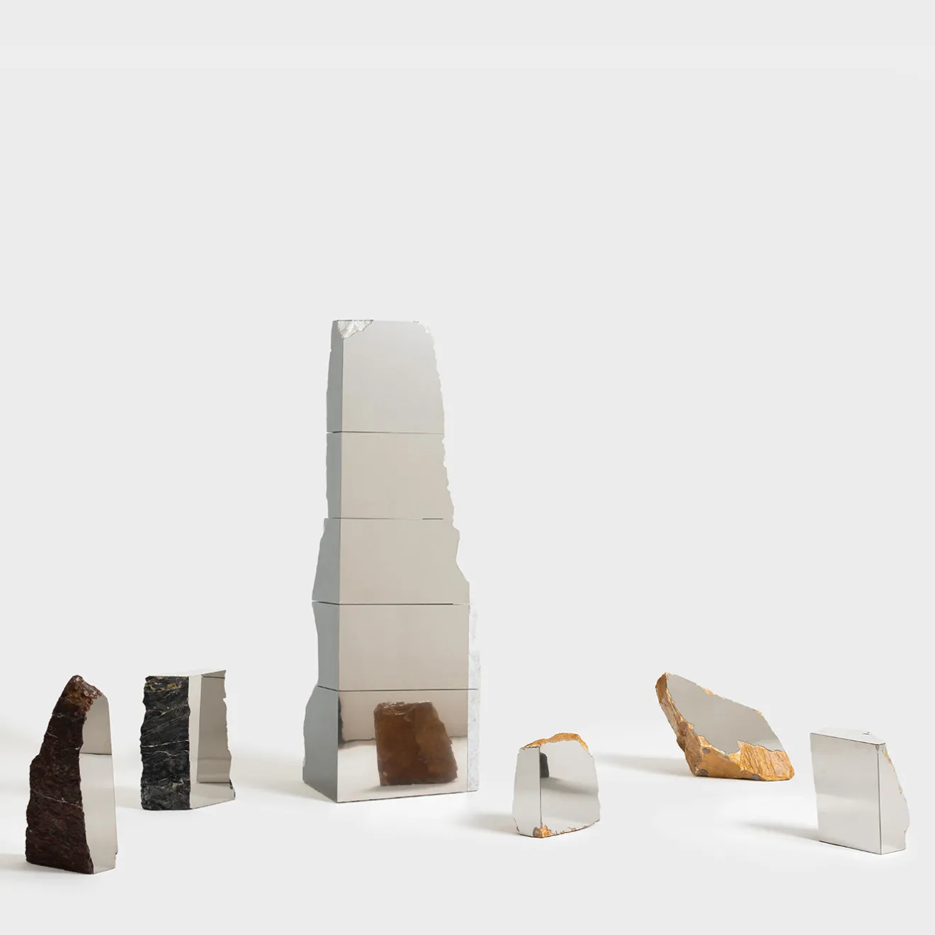 Specchio da terra con un design scultoreo che unisce materia grezza e raffinatezza artigianale. Realizzato a partire da un unico blocco di marmo di recupero, il pezzo presenta due identità contrastanti: da un lato la superficie naturale, ruvida e irregolare, dall’altro una lastra in acciaio lucidato a specchio che riflette e dematerializza visivamente la pietra. Questo dialogo tra peso materico e leggerezza percettiva trasforma lo specchio in un’opera contemporanea che celebra la bellezza intrinseca del marmo e la sua reinterpretazione attraverso il design. Design di Duccio Maria Gambi.