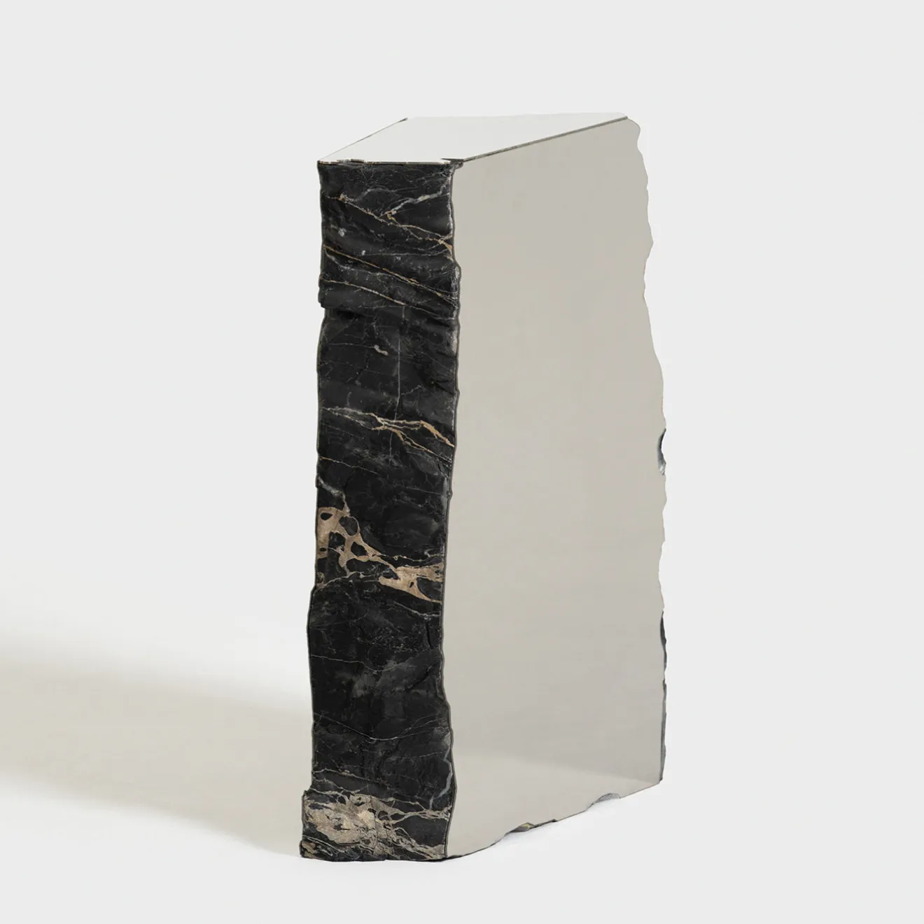 Lo specchio Immersione presenta un pezzo singolare di pietra naturale con un esterno grezzo e texturizzato, contrapposto a una superficie in acciaio liscia e riflettente. Questo design crea un sorprendente gioco di contrasti tra il marmo denso e robusto e l’effetto di smaterializzazione dello specchio, permettendo all’oggetto di fondersi visivamente con l’ambiente circostante. La forma dello specchio accentua la bellezza naturale della pietra, esplorando il rapporto tra l’essenza del materiale e l’ambiente.