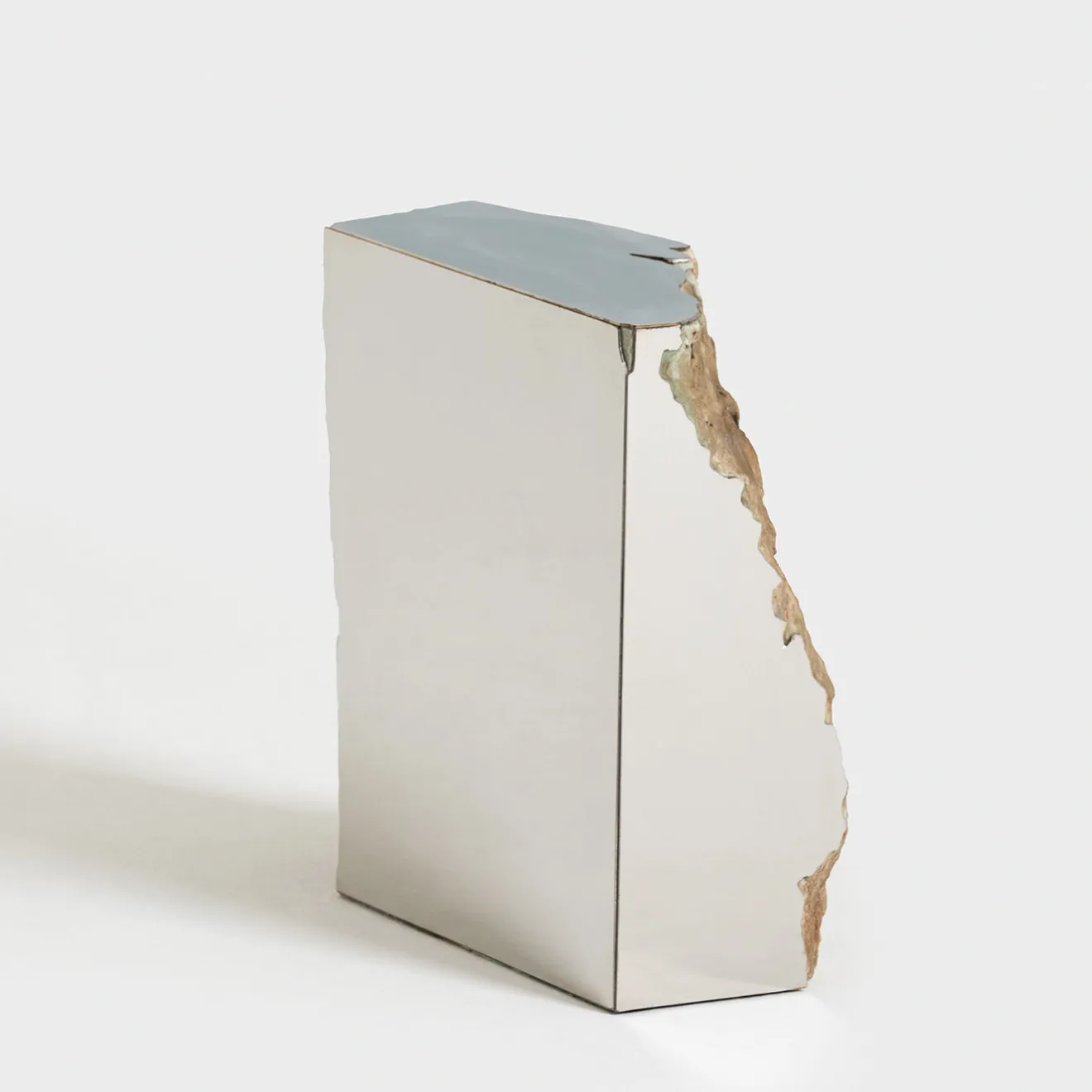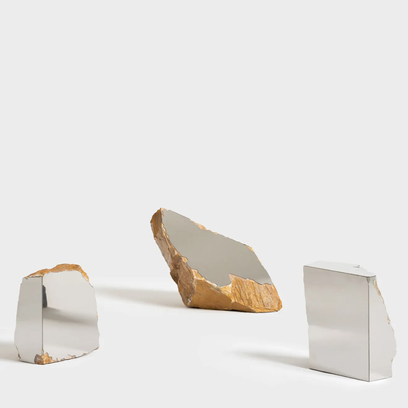 Lo specchio Immersione presenta un unico pezzo di pietra di scarto trovata, con un foglio di acciaio riflettente fissato al suo lato piatto, creando un contrasto sorprendente tra la superficie naturale grezza e testurizzata e la riflessione liscia e dematerializzante. La finitura a specchio dell’acciaio annulla visivamente la massa della pietra, permettendo all’oggetto di fondersi senza soluzione di continuità con l’ambiente circostante mentre enfatizza la densa bellezza del quarzite. Questo pezzo esemplifica un intervento minimale per evidenziare l’essenza e il carattere della pietra.