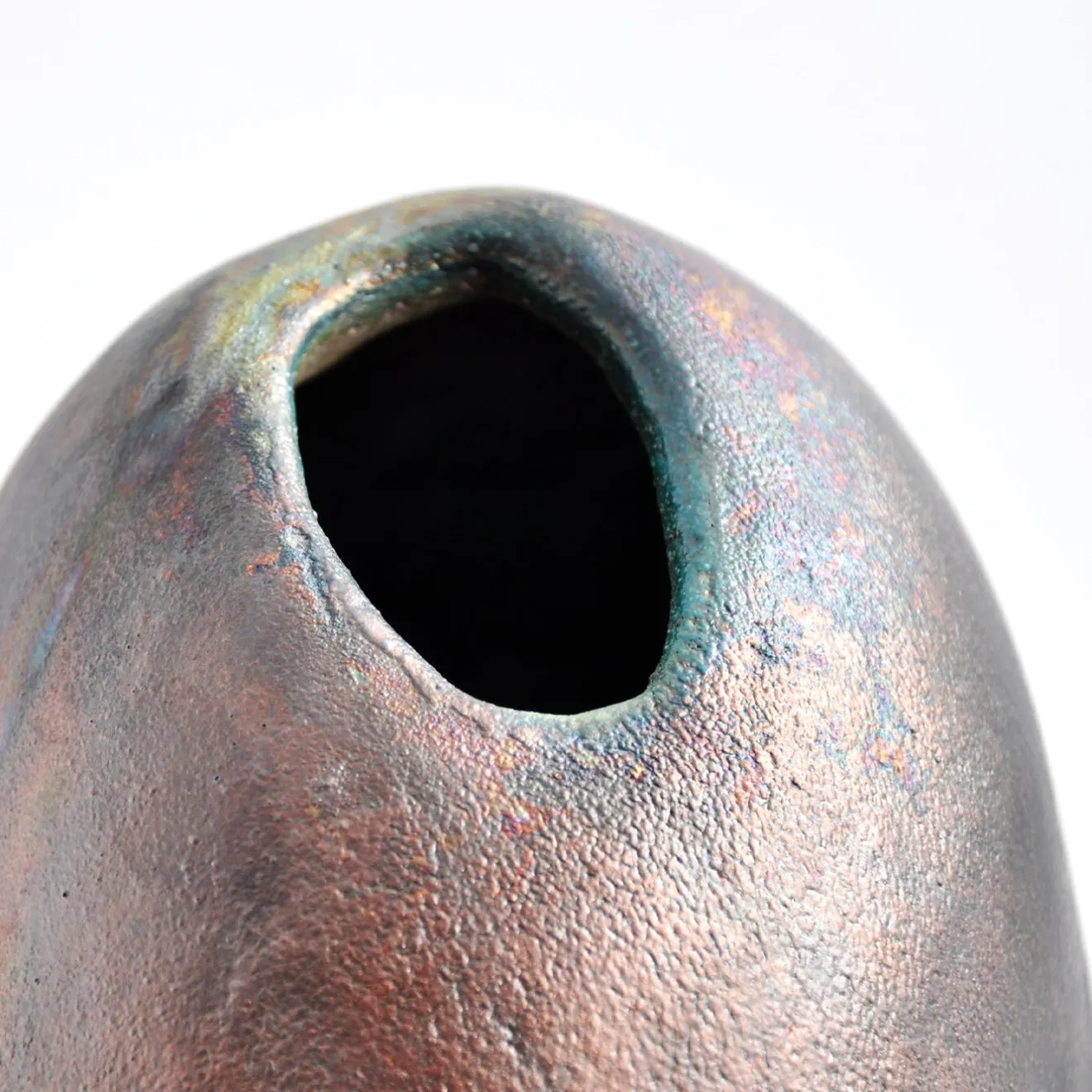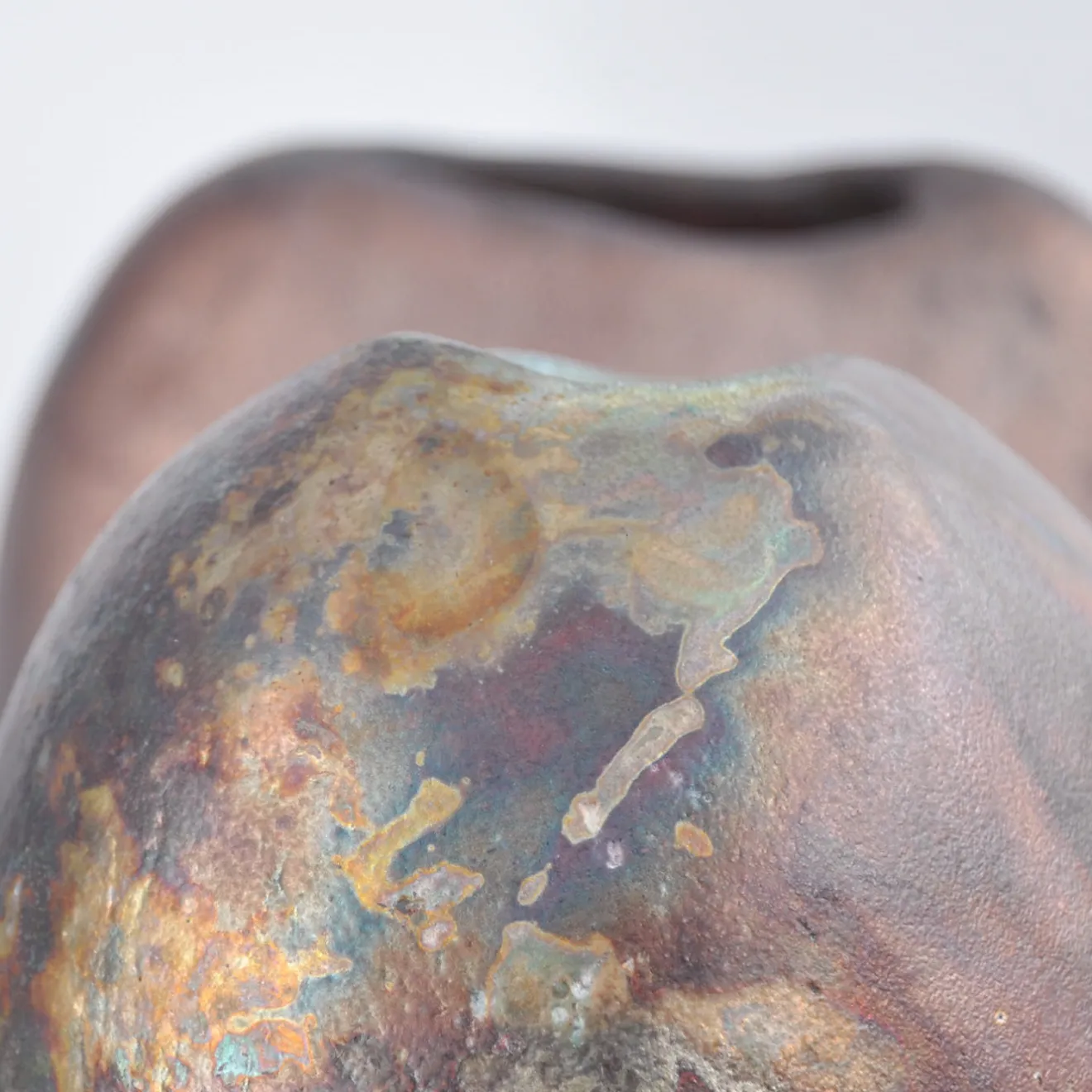 Scultoreo interamente utilizzando la tecnica della bobina e rifinito con l’antico metodo di cottura raku giapponese, questa unica scultura di 42 cm presenta curve sinuose e intrecciate che evocano una danza silenziosa o un abbraccio intimo. Ricca di tonalità metalliche di rame e bronzo che emergono da profondi neri, la superficie mostra riflessi iridescenti e cangianti. Le variazioni distintive di ciascun pezzo evidenziano l’energia dinamica e la qualità tattile del processo raku. Include imballaggio, certificato di autenticità e istruzioni per la cura. Pezzo unico.