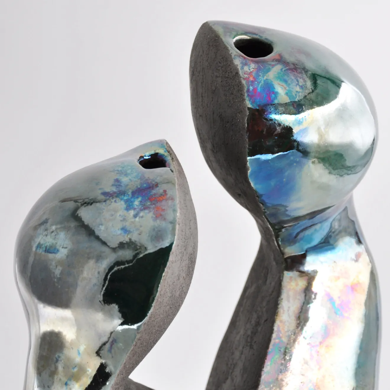 Intesa è una scultura ceramica contemporanea creata utilizzando la tecnica della coiling e rifinita con il tradizionale processo giapponese raku. Alta 42 cm, questo pezzo unico presenta due forme antropomorfe adagiate in un gesto sospeso, simboleggiando una profonda connessione silenziosa. La superficie iridescente, ottenuta attraverso la cottura a riduzione diretta, riflette tonalità cangianti con la luce, contrastando in modo sorprendente con l’interno nero opaco per esaltare il gioco tra luce, ombra e presenza. Include imballaggio, certificato di autenticità e istruzioni per la cura. Pezzo unico.
