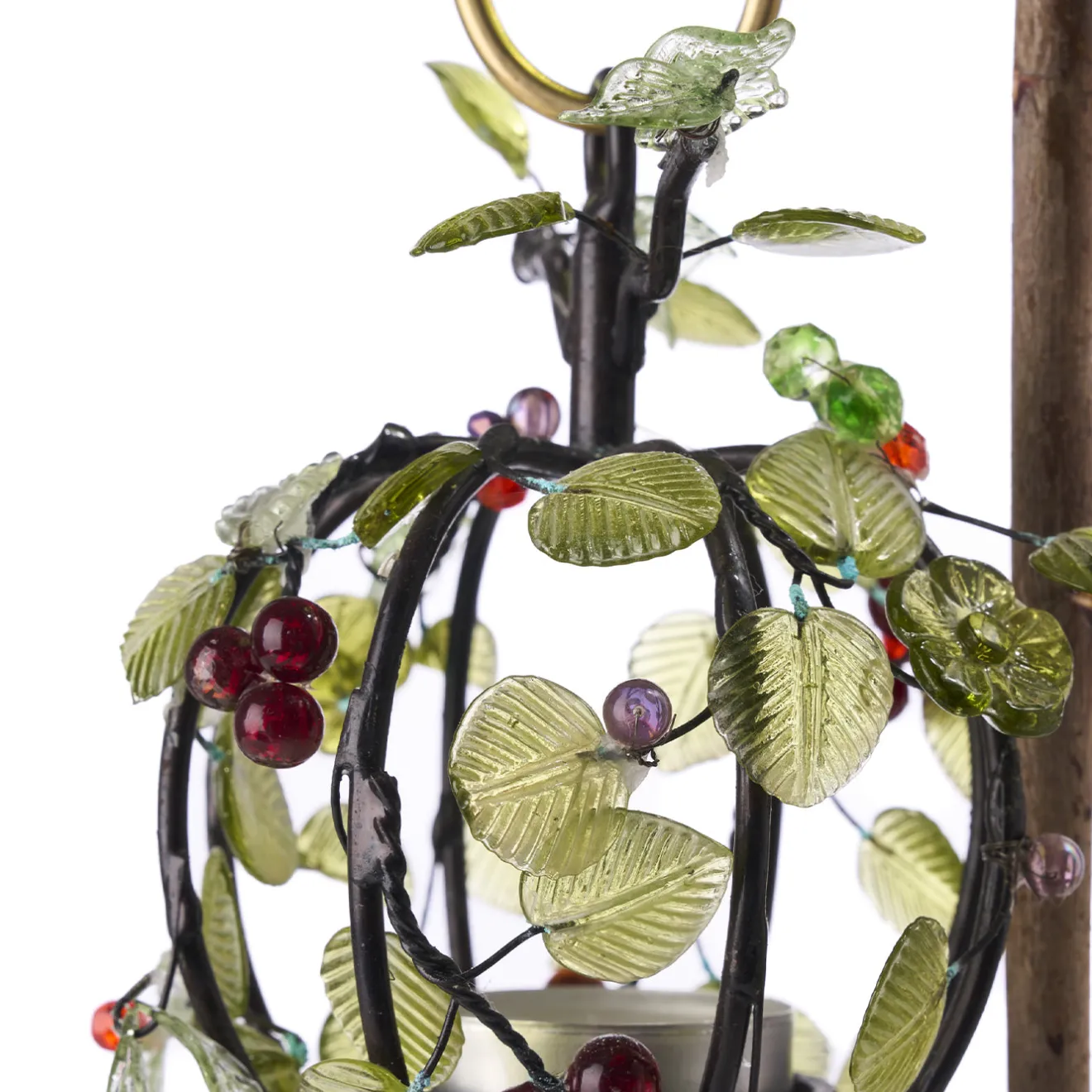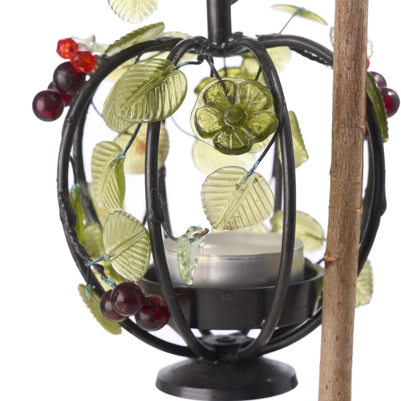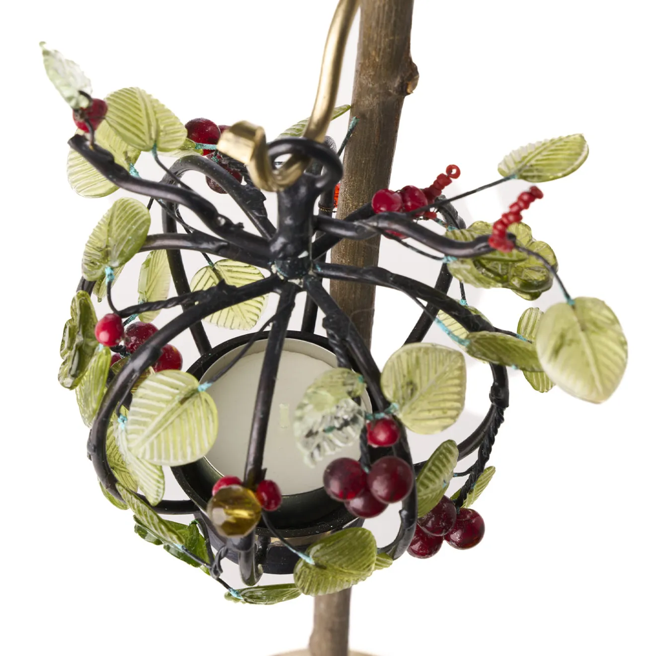 Questo centrotavola decorativo in legno per candele presenta un sottile stelo di legno con una base in ottone e un supporto che racchiude la candela. Attorno alla candela si trovano foglie in metallo delicatamente lavorate e bacche di vetro, che ne migliorano l’appeal visivo. Il suo design intricato crea un’atmosfera calda e invitante quando è accesa, rendendola adatta per la decorazione di tavoli o mobili, particolarmente efficace in contesti serali.