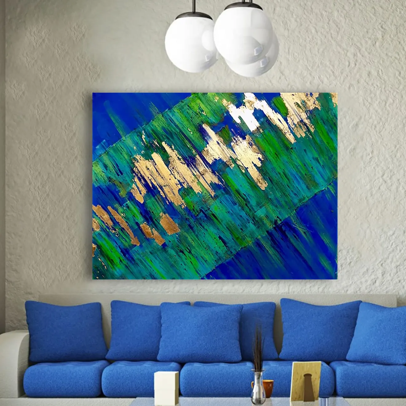 Realizzata con maestria utilizzando la tavolozza a coltello per stendere pesanti strati di pittura acrilica verde e blu, quest’opera d’arte interpreta l’immagine di un meteorite evocandone il senso di movimento sfocato. Gli strati sovrapposti rappresentano il passato, il presente (al centro) e il futuro, mentre la raffinata aggiunta di inserti di foglie d’oro e d’argento conferisce dinamismo all’opera. Questo eccezionale dipinto è personalizzabile nelle dimensioni su richiesta, con una variazione del prezzo e delle caratteristiche.