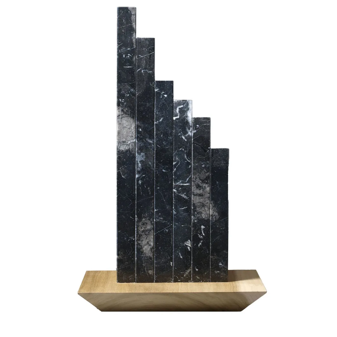Questa maestosa scultura, che prende il nome dal “Grattacielo nero” italiano, è un’eccezionale espressione del tema artistico di Ennio Nonni della “Città verticale”. La sua silhouette, rigorosa e drammaticamente stilizzata, ricorda i profili di una ziggurat e poggia su una base di legno duro, ed è composta da sottili lastre di marmo nero fissate a elementi di legno coordinati.
