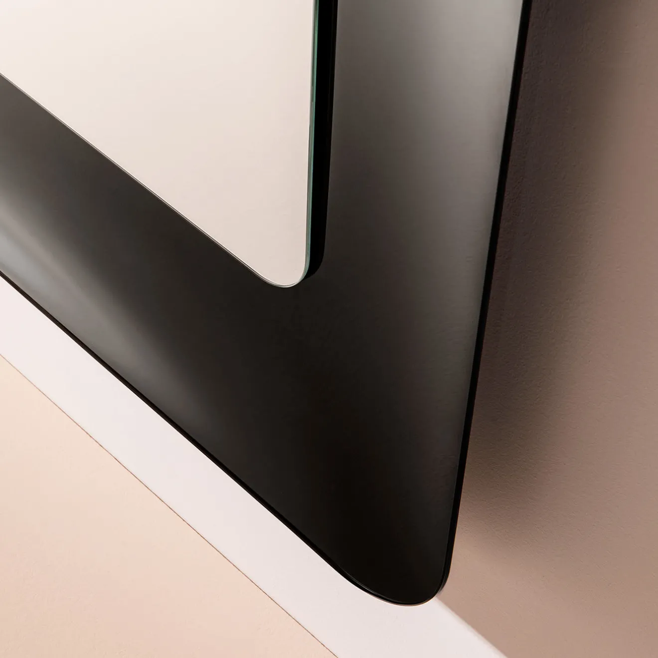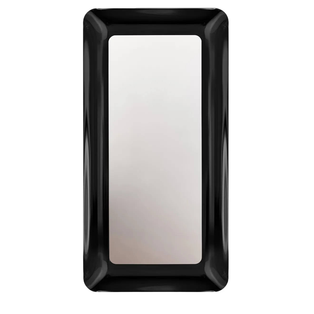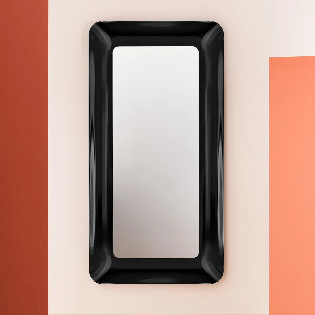 Vetro extrachiaro o colorato, argentatura artigianale. Le forme armoniose e lineari fanno di questo pezzo un complemento senza tempo. Specchio composto da due elementi. Specchio centrale in vetro piano, cornice concava specchiata e curva. Colori disponibili: Argento, Rame lucido, Bronzo, Blu, Nero, Azur.