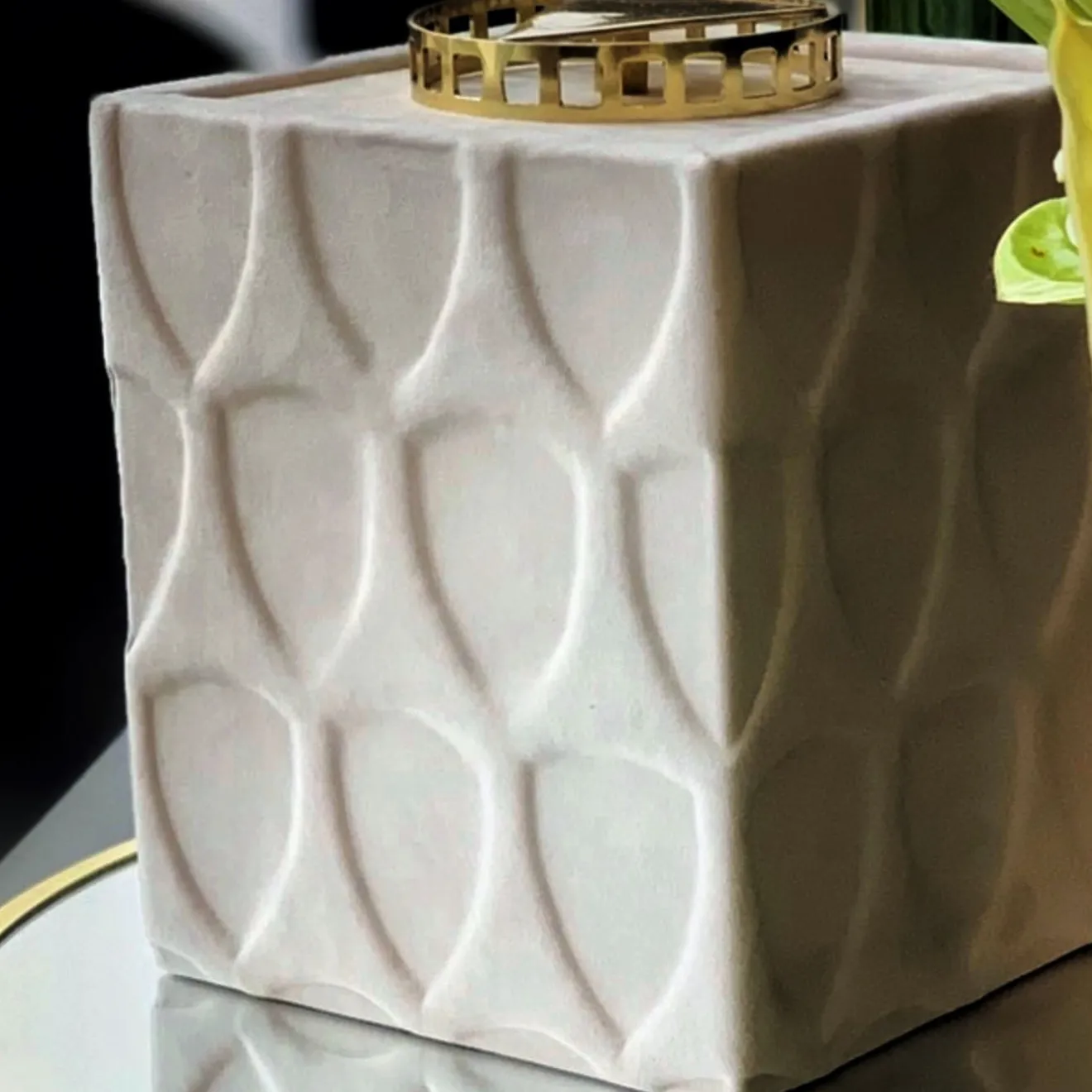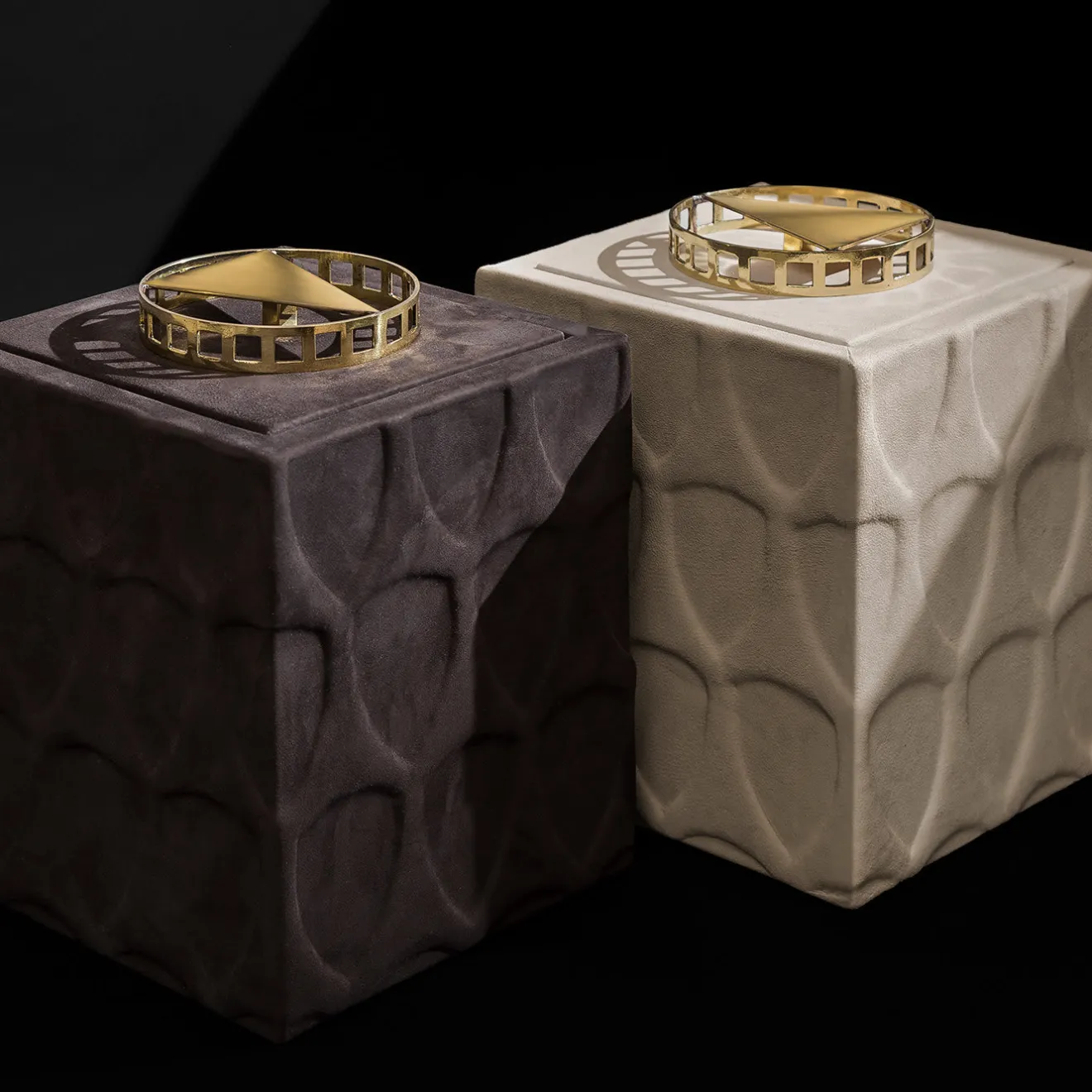 Questo raffinato cofanetto, dal design sartoriale e gioiello, offre un’atmosfera lussuosa grazie a dettagli che richiamano gli stili architettonici minimalisti. Il pomello in ottone luminoso si ispira ai volumi della Yale University Art Gallery di Louis Kahn, mentre i volumi geometrici puri della struttura in legno, impreziositi da una texture tettonica e ripetuta, celebrano l’architettura brutalista. Laccato in arancione, il pezzo è rivestito esternamente in pregiata pelle Nubuck beige.