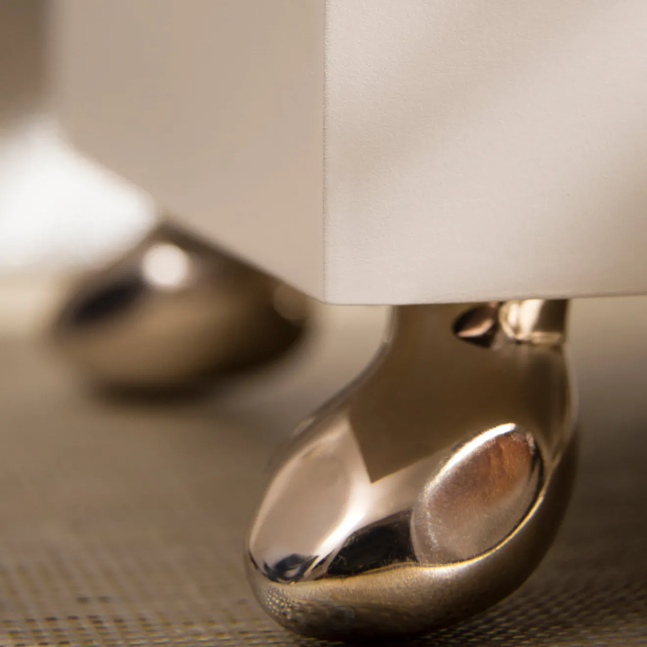 Piedi metallici scintillanti e simili a ciottoli offrono un elegante sostegno a questa scatola di lusso, un prezioso pezzo d’accento ispirato alla Cattedrale dell’Arcidiocesi di Monaco. Il contenitore in legno è laccato esternamente in bianco ed è composto da due scatole distinte annidate l’una nell’altra e rifinite in un vibrante blu per creare una tavolozza regale insieme al coperchio a griglia in ottone lucido, il cui design rende omaggio allo stile geometrico del pavimento della cattedrale.