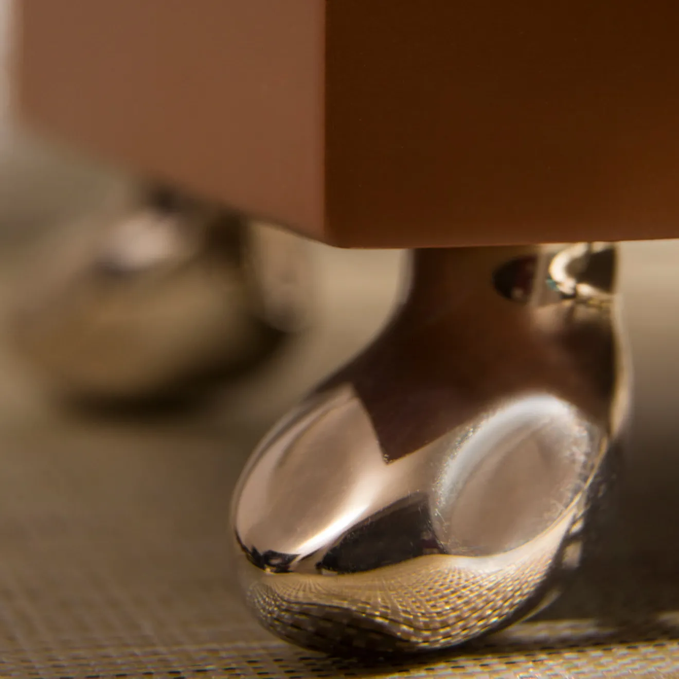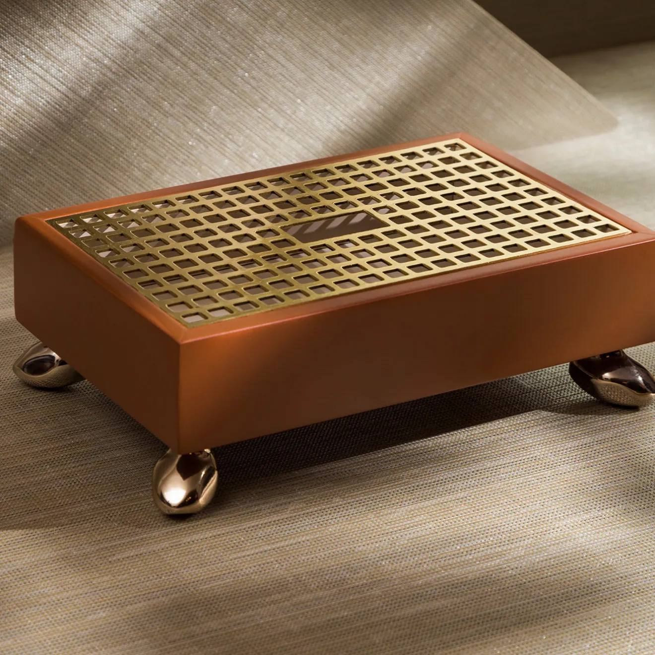 Questo raffinato cofanetto artigianale è una lussuosa dimora per piccoli oggetti e può fungere anche da vide-poche rialzata grazie al design a griglia del suo coperchio in ottone, preziosamente ispirato al pavimento della cattedrale dell’Arcidiocesi di Monaco. Il contenitore è composto da due scatole annidate l’una nell’altra, che rivelano una laccatura bianca all’interno e una calda laccatura marrone all’esterno della struttura in legno. I piedini metallici scintillanti, simili a ciottoli, completano il design.