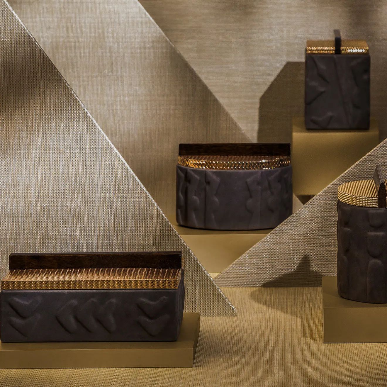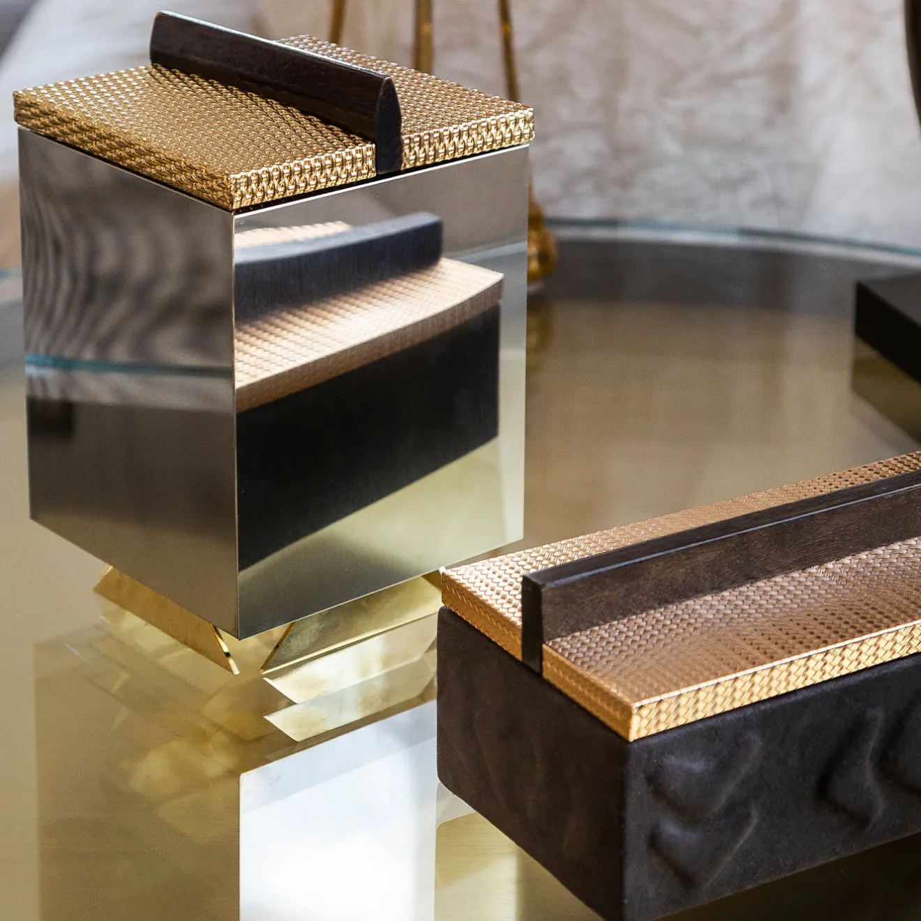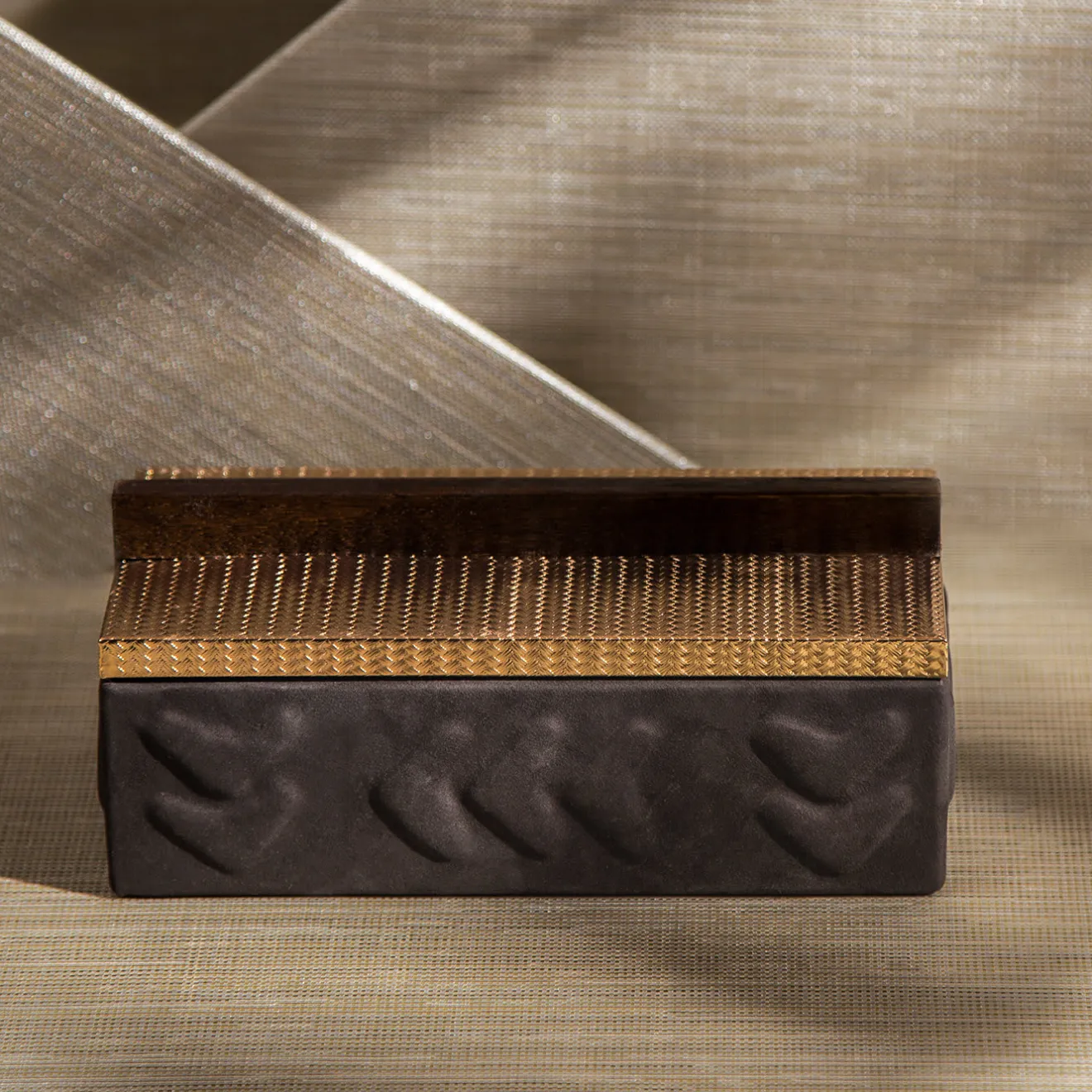 Questo esclusivo cofanetto artigianale è un’aggiunta preziosa a uno studio privato o a un comò, per raccogliere la cancelleria o i gioielli preferiti. Il coperchio in ottone scintillante, con una piacevole trama a rete, è completato da un pomello in legno che celebra l’architettura brutalista e crea un’armonia tonale con la pelle Nubuck marrone scuro che avvolge completamente il guscio in massello di noce canaletto. Il legno è arricchito da un motivo a rilievo di soggetti presi in prestito dall’arte precolombiana.