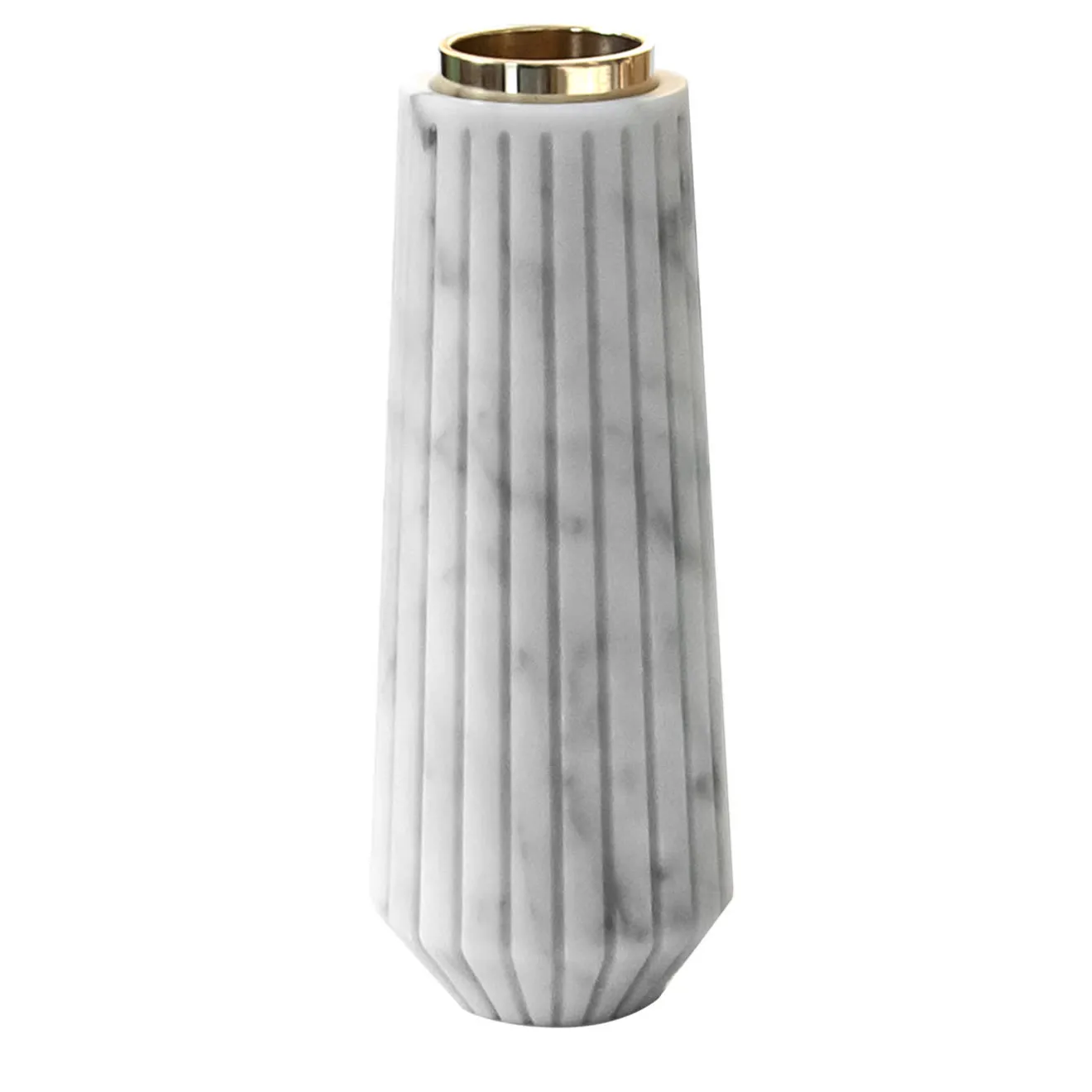 Portacandele a righe in marmo bianco di Carrara e ottone grande. Ogni pezzo è in qualche modo unico (ogni blocco di marmo è diverso per venature e sfumature) e realizzato a mano da artigiani italiani specializzati da generazioni nella lavorazione del marmo. Lievi variazioni di forma, colore e dimensione sono da considerarsi garanzia di una creazione artigianale. È importante non usare limone o aceto su di esso, pulire solo con acqua e sapone naturale (come il sapone di Marsiglia), non metterlo in lavastoviglie.
