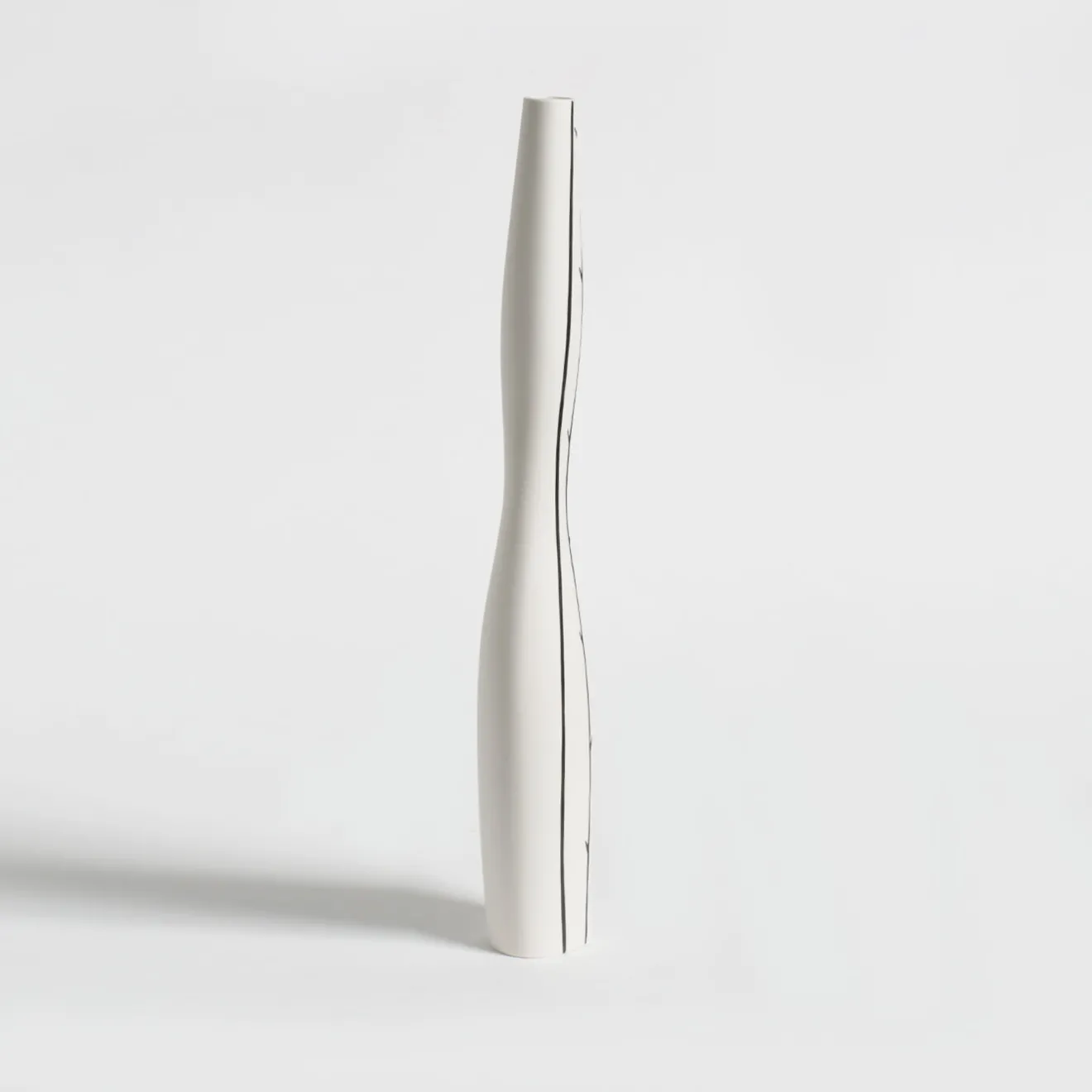 In questa raffinata bottiglia di porcellana, il design minimalista, ispirato a figurine antropomorfe, è in porcellana non smaltata, o “biscotto”, arricchito da suggestivi dettagli in nero che corrono verticalmente lungo la superficie del vaso come sinuosi rami di spine.
