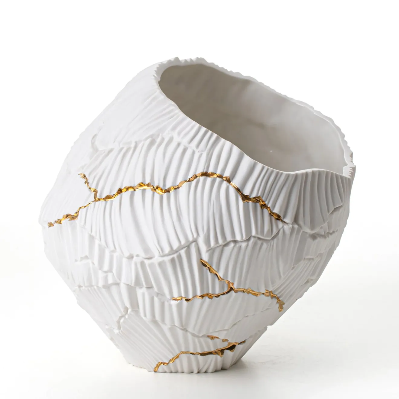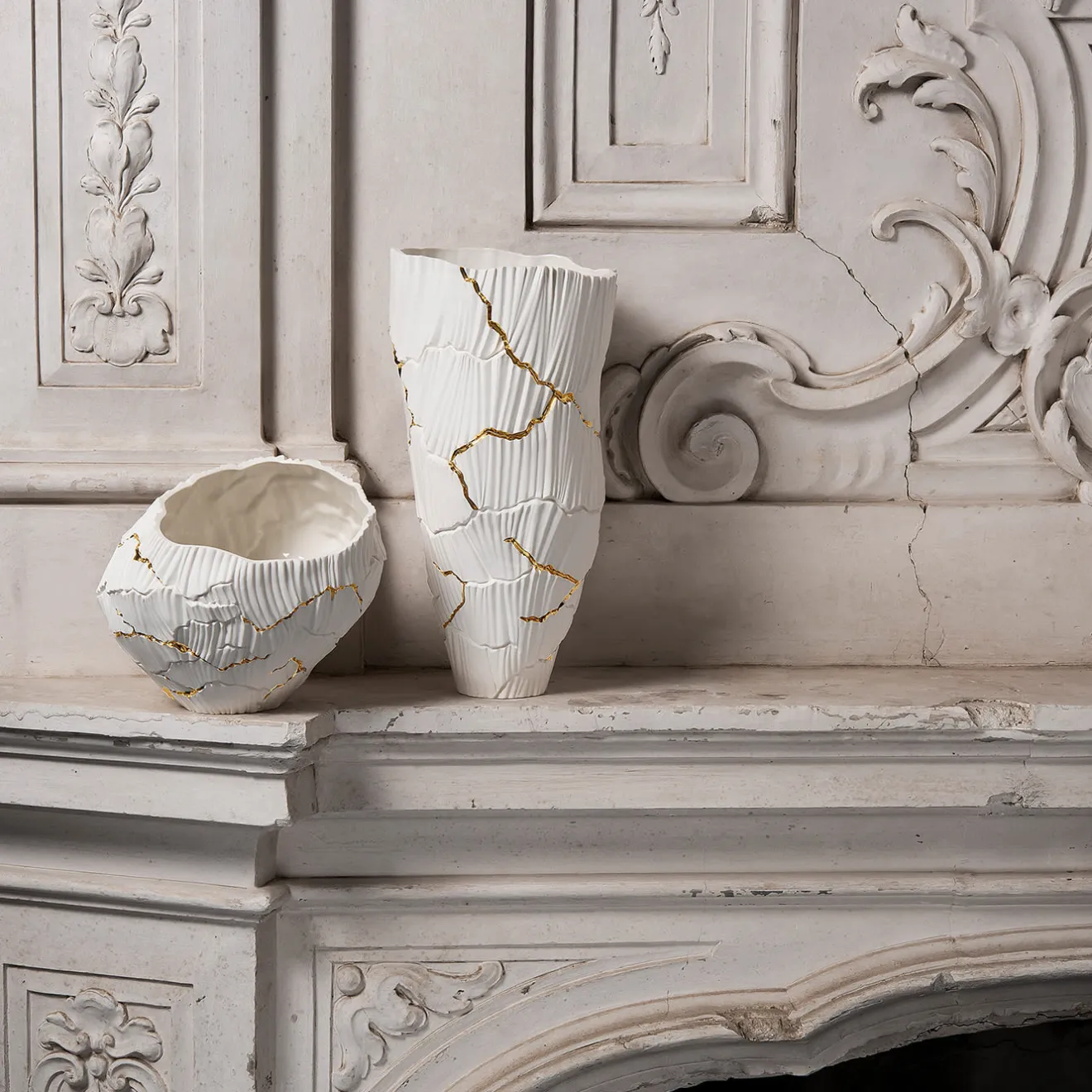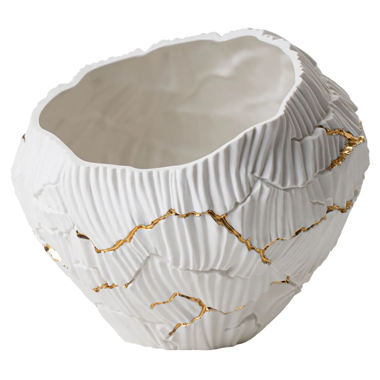 Zefiro è una sofisticata ciotola decorativa in porcellana, parte della collezione Anemos. Le morbide curve dei canali modellati dal vento creano un ritmo unico sulla superficie, interrotto da profonde crepe, come una terra asciutta che svela un prezioso segreto. Il bianco puro della porcellana è enfatizzato dall’alternanza di luci e ombre, la cifra stilistica di FOS Ceramiche. Rocce scavate dagli agenti atmosferici e attraversate da crateri in oro 23K, che creano una sorta di kintsugi minerale.