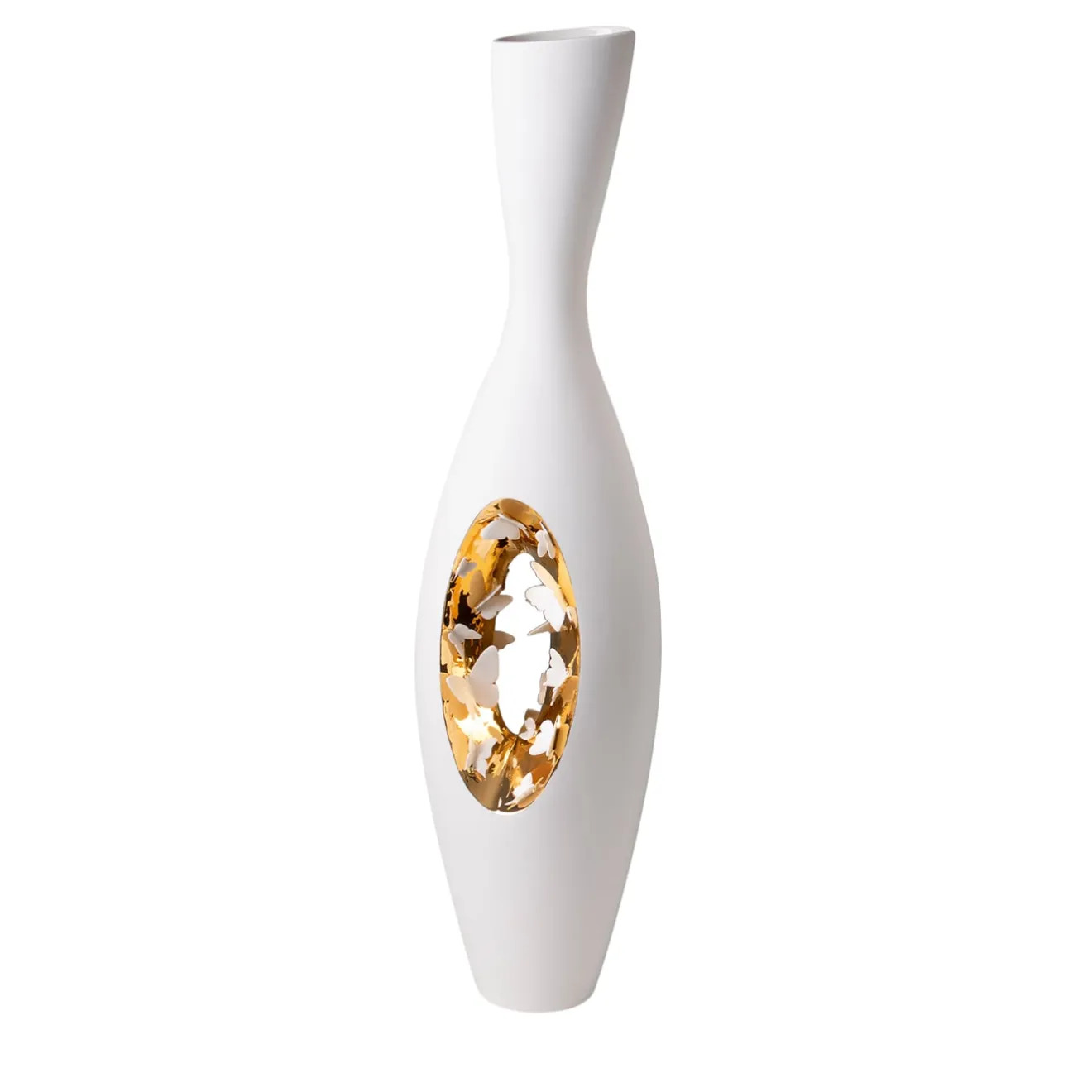 Questa coppia di vasi in porcellana è una rappresentazione ironica dell’amore e del suo sintomo più noto, le “farfalle nello stomaco”. L’interno (lo stomaco) di questi vasi antropomorfi mostra una moltitudine di farfalle che danzano nei bagliori dell’oro 23k. Ogni farfalla è diversa dalle altre perché sono completamente fatte a mano, una per una, rendendo questi vasi delle vere e proprie opere d’arte. Il prezioso oro viene applicato a mano e fissato attraverso un ulteriore e meticoloso processo di cottura. Le dimensioni dei 2 vasi sono nello specifico: 19x11x58 cm e 15x9x58 cm.