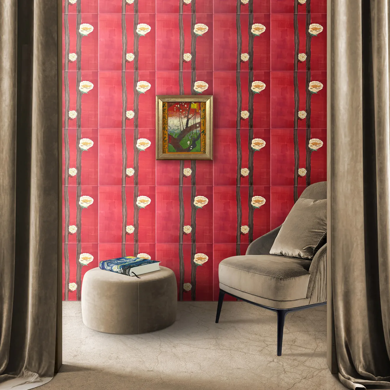 Un accattivante dettaglio floreale preso in prestito dal dipinto “Flowering Plum Orchard (after Hiroshige)” di Vincent van Gogh conferisce a questa preziosa piastrella in ceramica il suo caratteristico tocco artistico. L’audace uso delle tonalità di rosso che contraddistinguono l’originale è qui rispettato insieme a dettagli minuziosi che catturano accuratamente l’estetica vibrante del pittore che ha scelto di reinterpretare l’eleganza poetica della tradizione artistica giapponese. Il prezzo si intende al metro quadro.