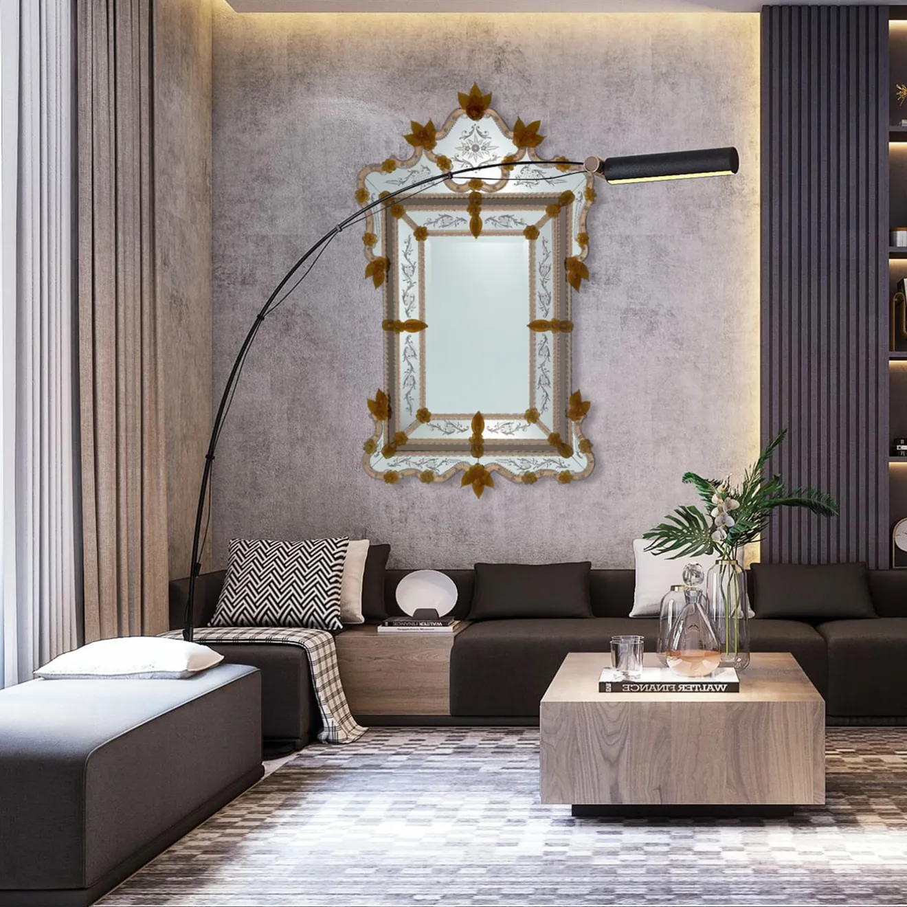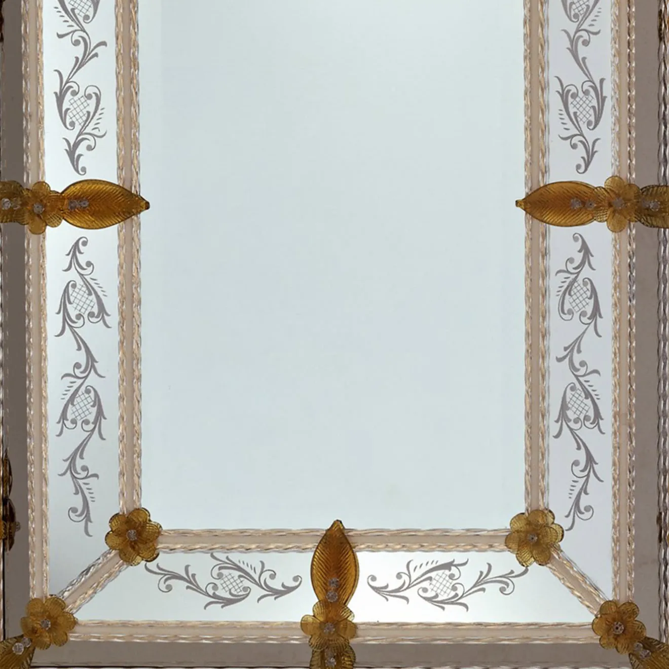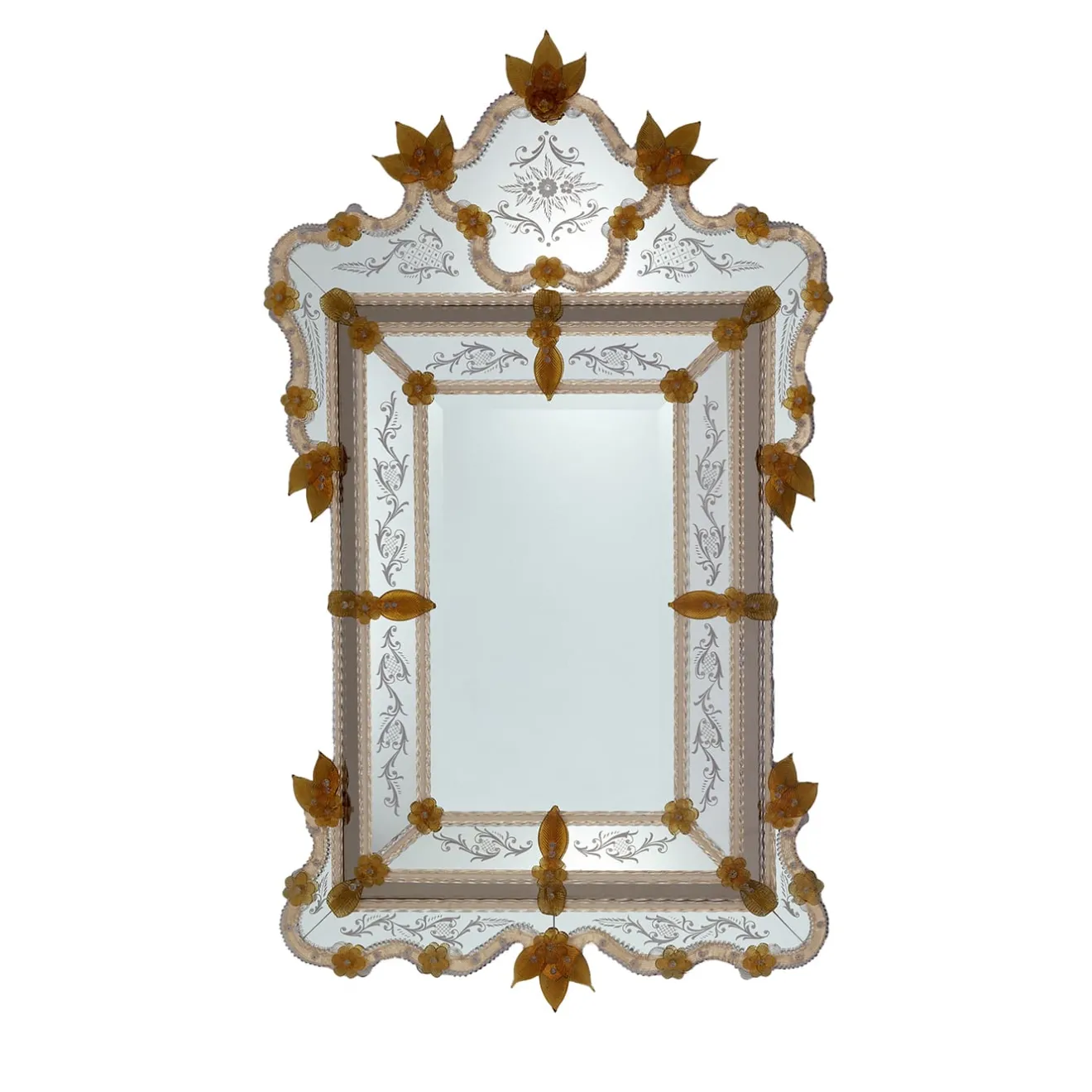 Specchio in vetro di Murano “Toronto” in stile veneziano, realizzato dalle mani esperte dei maestri muranesi. La cornice è composta da bacchette e riccioli di cristallo su fondo oro. Le incisioni che adornano questo lussuoso specchio sono interamente realizzate a mano e le finiture, costituite da rose e foglie di varie dimensioni e di colore “Ambra”, impreziosiscono questo meraviglioso specchio creato nel laboratorio Fratelli Tosi sull’isola di Murano.