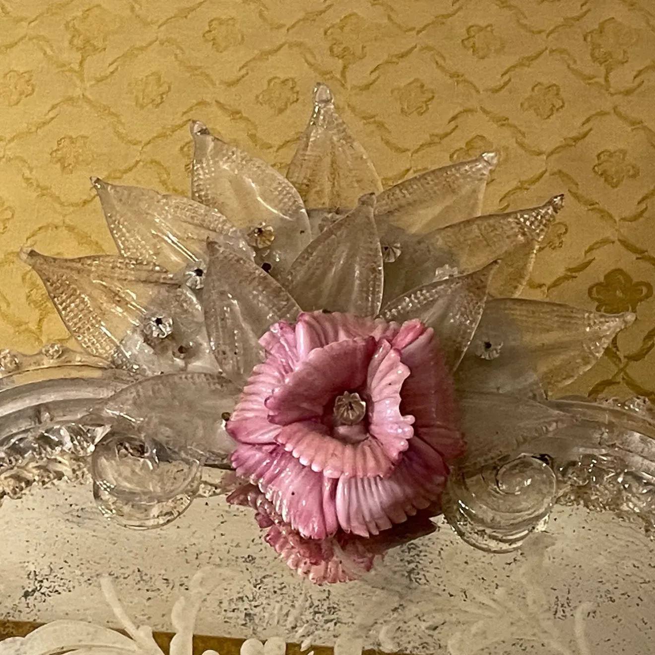 Una serie di foglie e dettagli di fronde in cristallo anticato impreziosiscono la sinuosa cornice di questo sublime specchio unico, realizzato a mano da maestri vetrai veneziani. Gli inserti floreali tridimensionali in pasta di vetro multicolore aggiungono un tocco di colore e di fascino romantico, completando il pezzo. Questo specchio sarà un’aggiunta accattivante all’ingresso, sopra una consolle o in una camera da letto principale, sopra un vanity.
