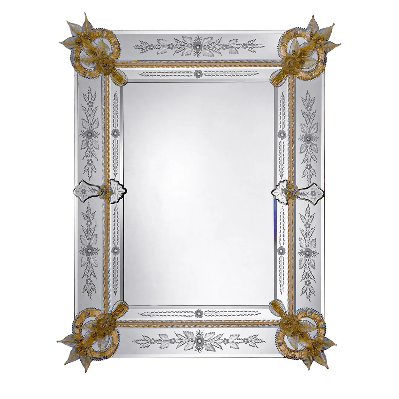 Questo specchio mozzafiato risplenderà nelle camere da letto classiche se appeso sopra una scrivania o un comò. Il centro trasparente è incorniciato da minuscoli motivi floreali realizzati a mano e impreziositi da fiori e foglie dorate in 3D in vetro di Murano che conferiscono una raffinatezza senza pari. Abilmente smussato a mano, il pezzo è interamente realizzato a mano da maestri vetrai veneziani secondo le tecniche sviluppate durante il Rinascimento italiano.