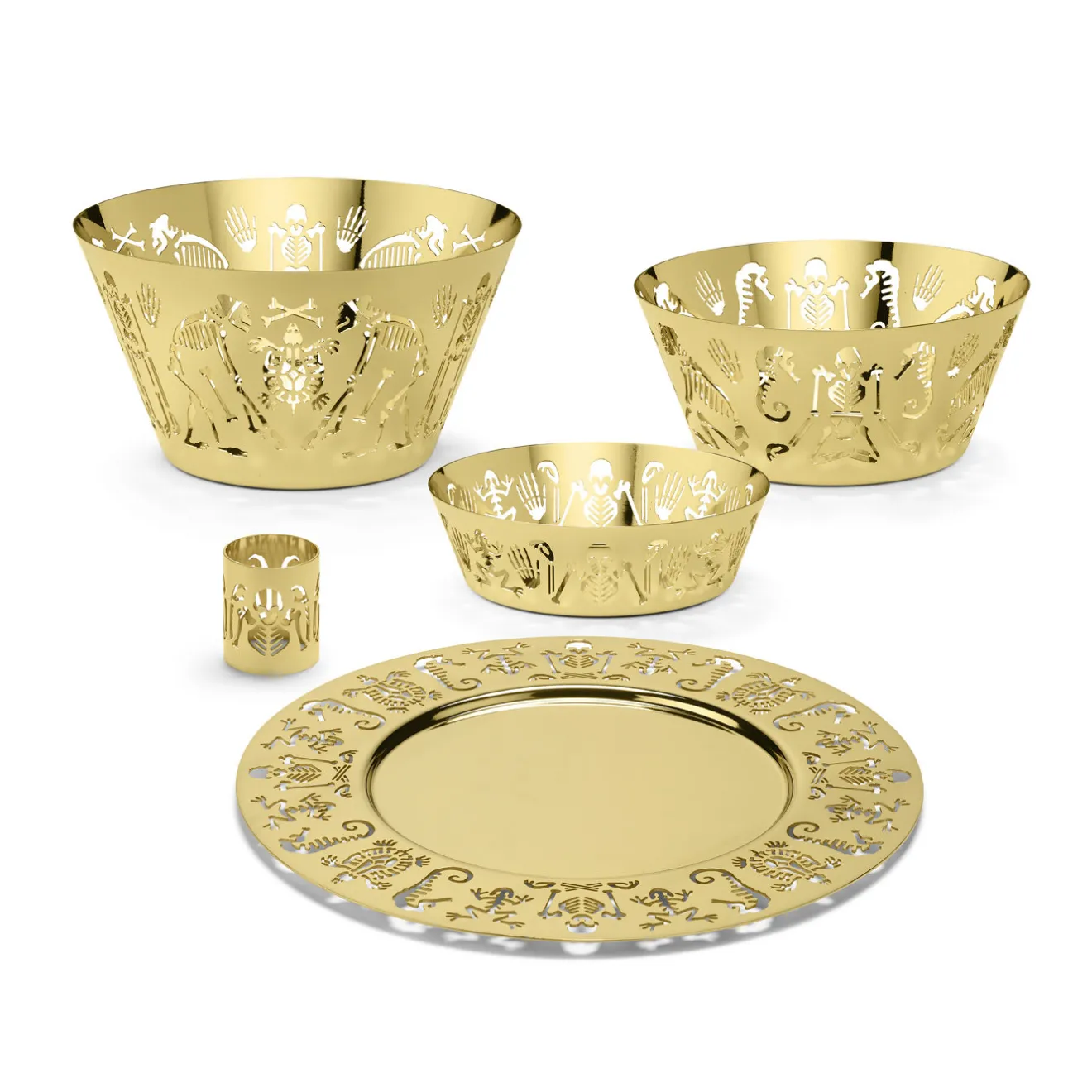 Questa grande ciotola è un superbo oggetto di arredamento funzionale che servirà elegantemente il cibo su una tavola moderna, aggiungendo al contempo un accento decorativo unico e ipnotico. Interamente realizzata in ottone, la forma conica della ciotola vanta una ghirlanda di scheletri umani, di scimmie e di tartarughe in una danza stravagante. Ideale come pezzo d’accento indipendente su un tavolo o come oggetto da collezione su un tavolino da caffè, questo pezzo farà una dichiarazione sofisticata in un interno contemporaneo insieme ad altri pezzi della serie Perished.