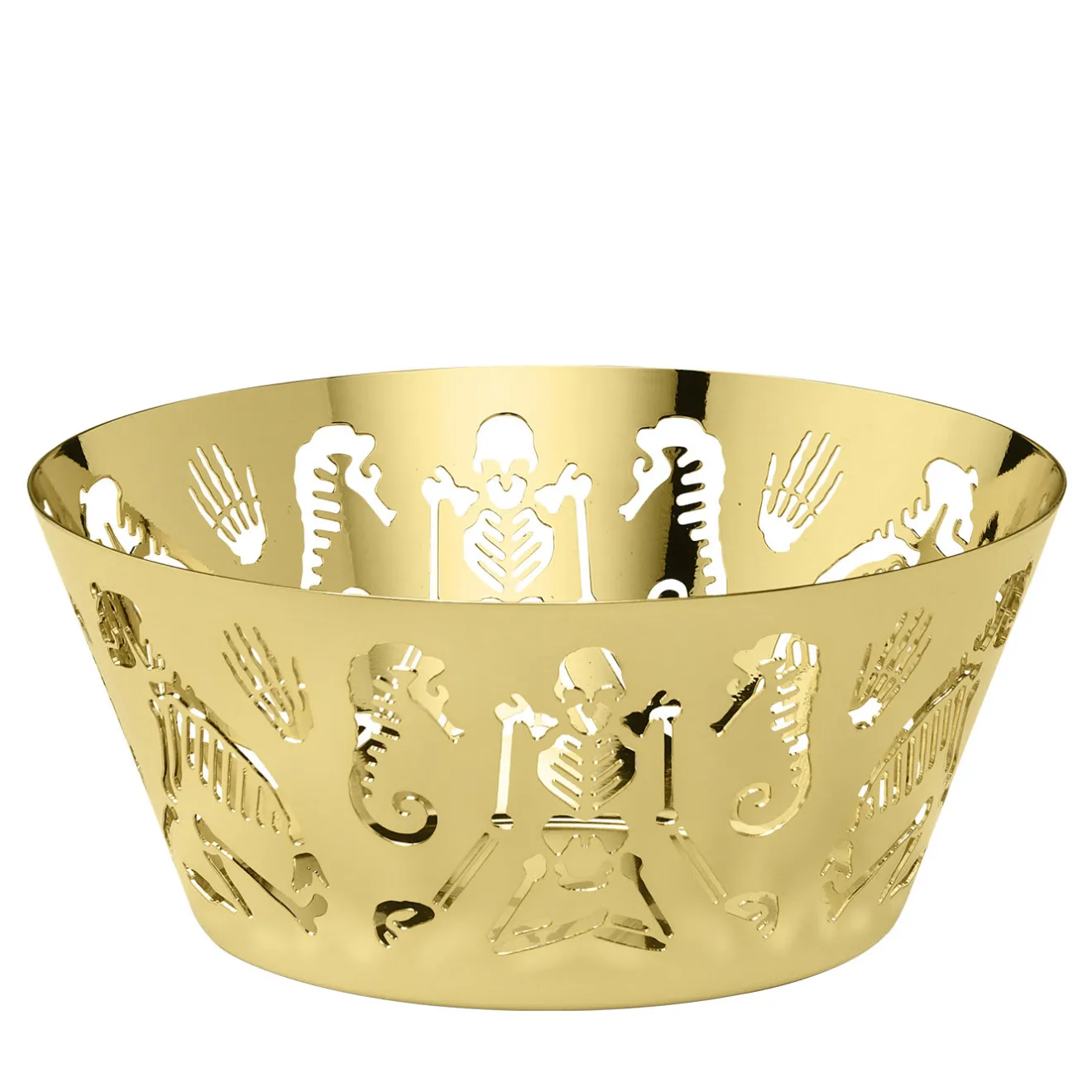Parte della collezione Perished, questo complemento d’arredo funzionale è stato realizzato in acciaio e la sua classica forma conica è reinterpretata con sensibilità contemporanea, grazie alle decorazioni traforate che ne ornano i lati con scheletri e ossa stilizzate. Questo pezzo, moderno e giocoso, combina un’impeccabile maestria artigianale con un fascino moderno e si farà notare come ciotola o centrotavola.