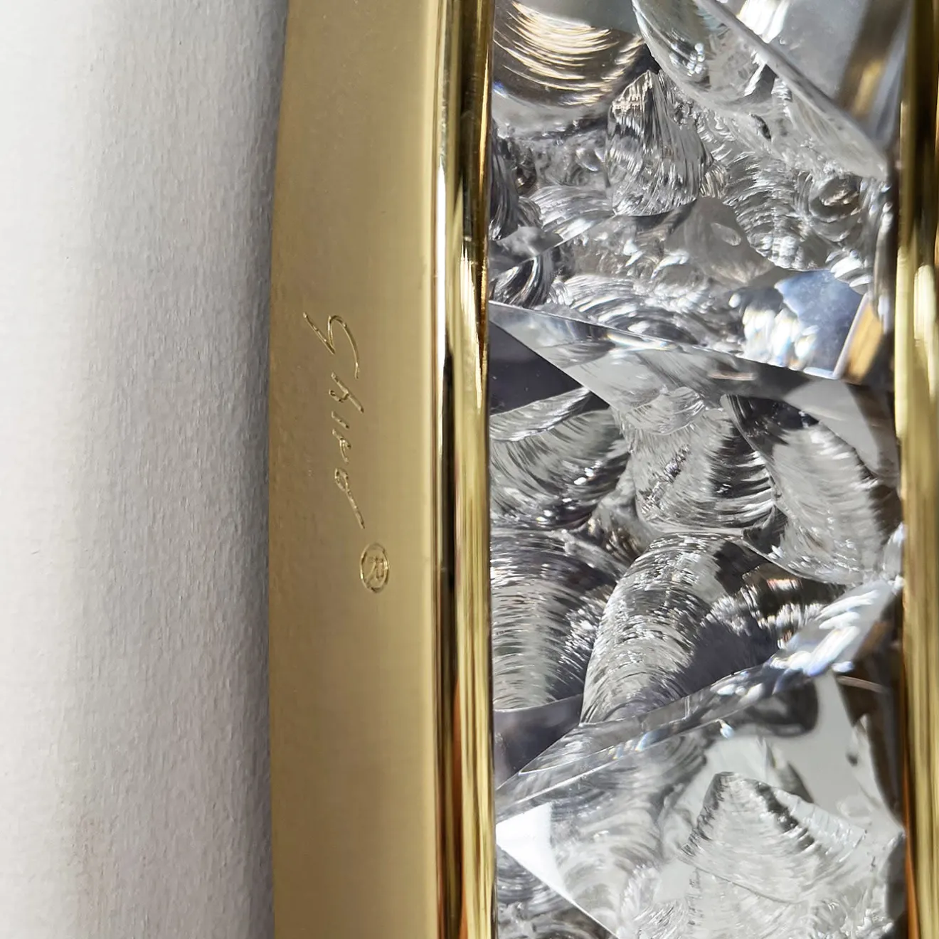 Lo specchio da parete Martelè è un oggetto artistico di pura arte e design italiano. La struttura portante è in ottone placcato oro lucido 24 kt. La cornice ovale dello specchio è composta da tessere di cristallo intagliate a mano e disposte con precisione l’una accanto all’altra. Il cristallo lavorato è ricco di riflessi di luce che rendono questo specchio non solo luminoso ma anche elegante e originale. La lavorazione artigianale e artistica rende questo oggetto una creazione unica. A causa della lavorazione artigianale, possono verificarsi lievi variazioni.